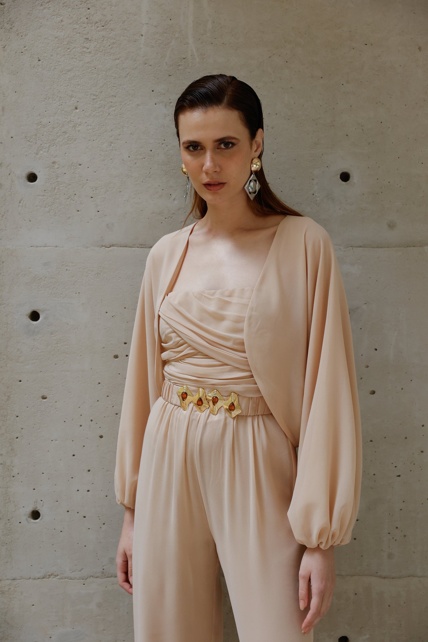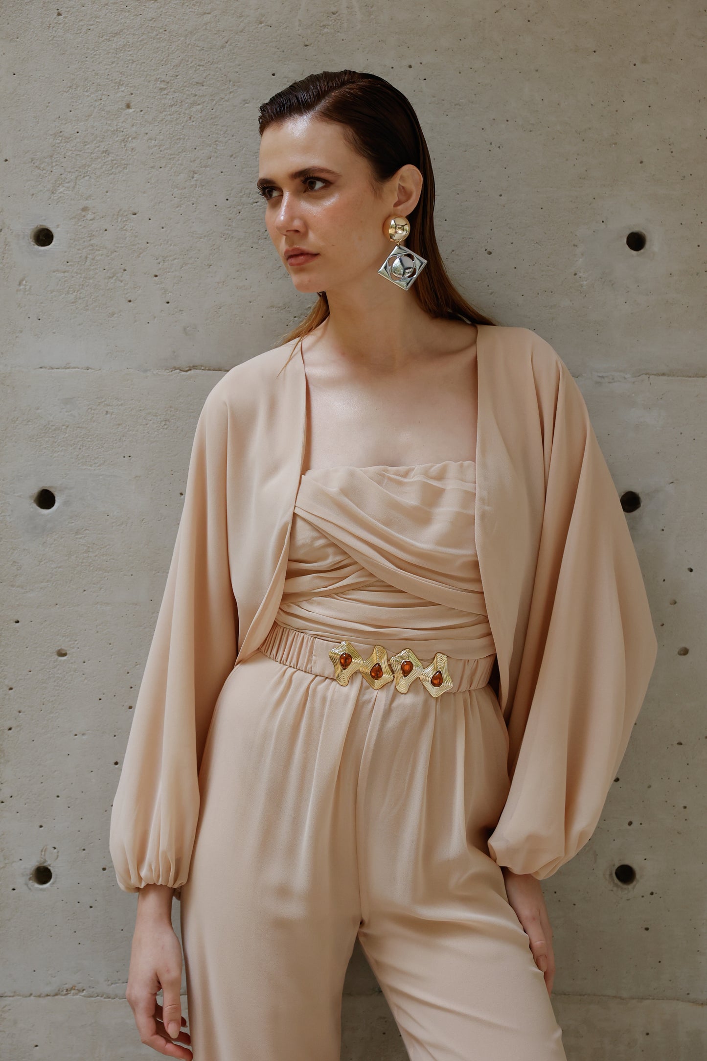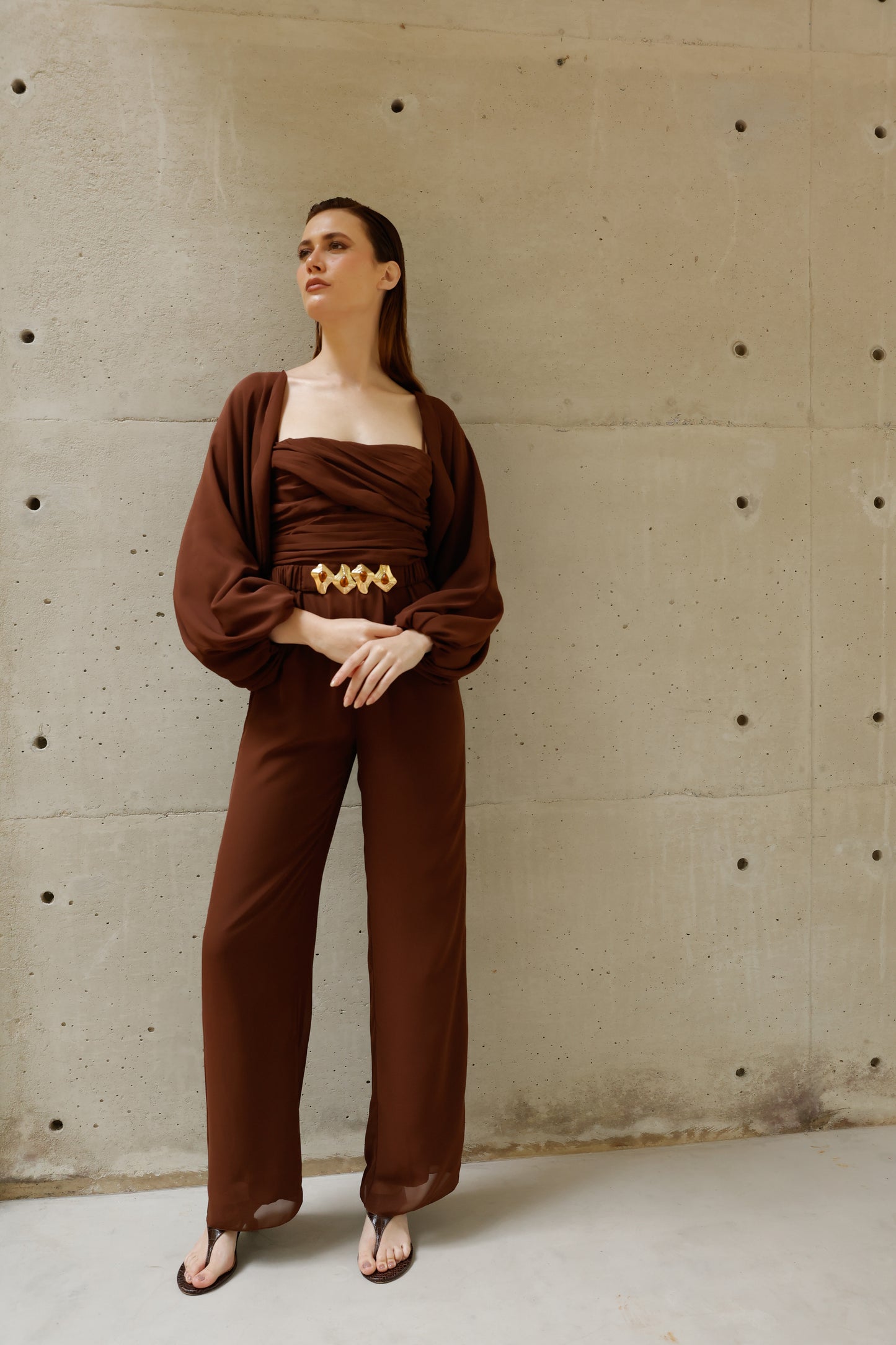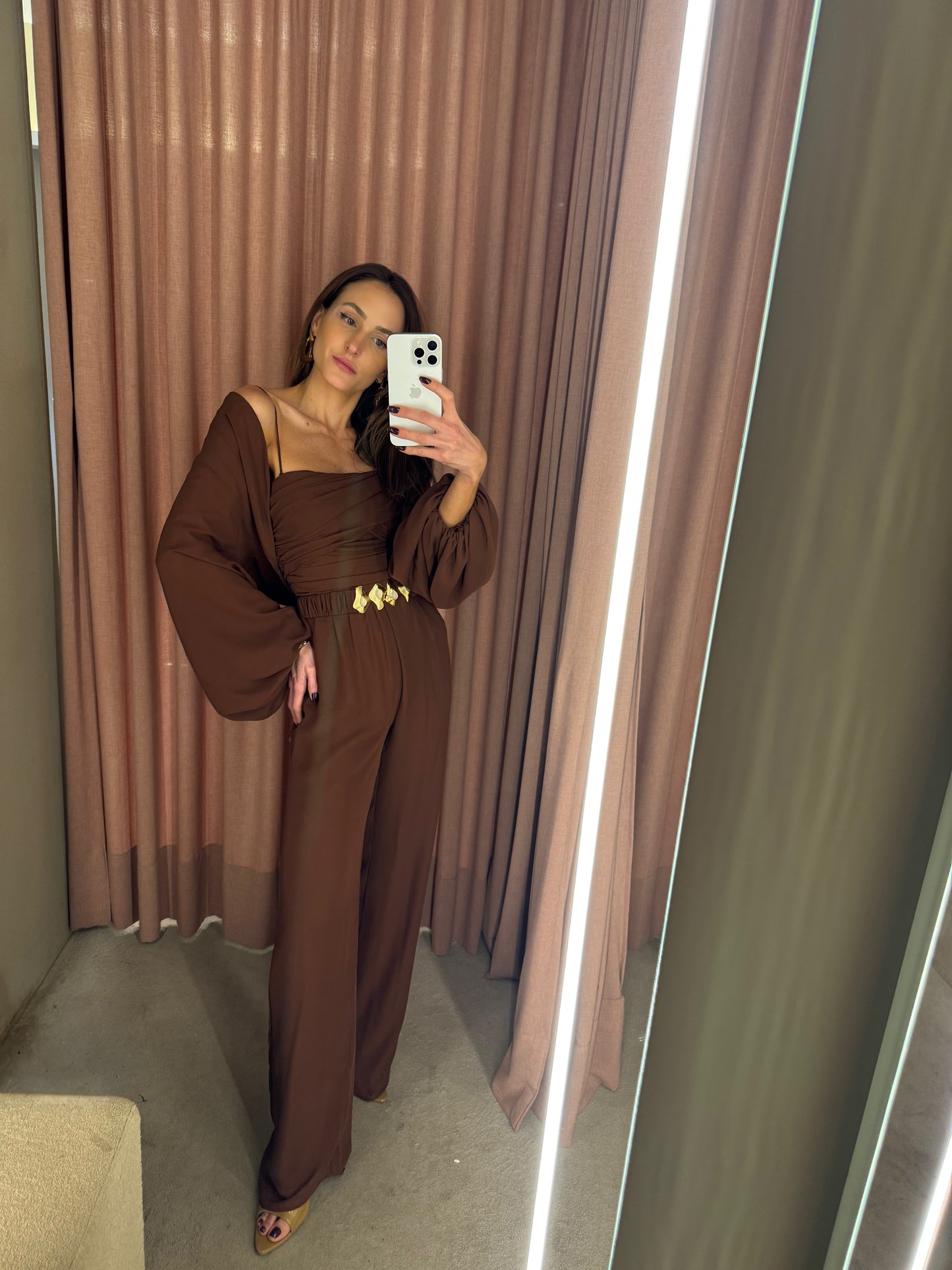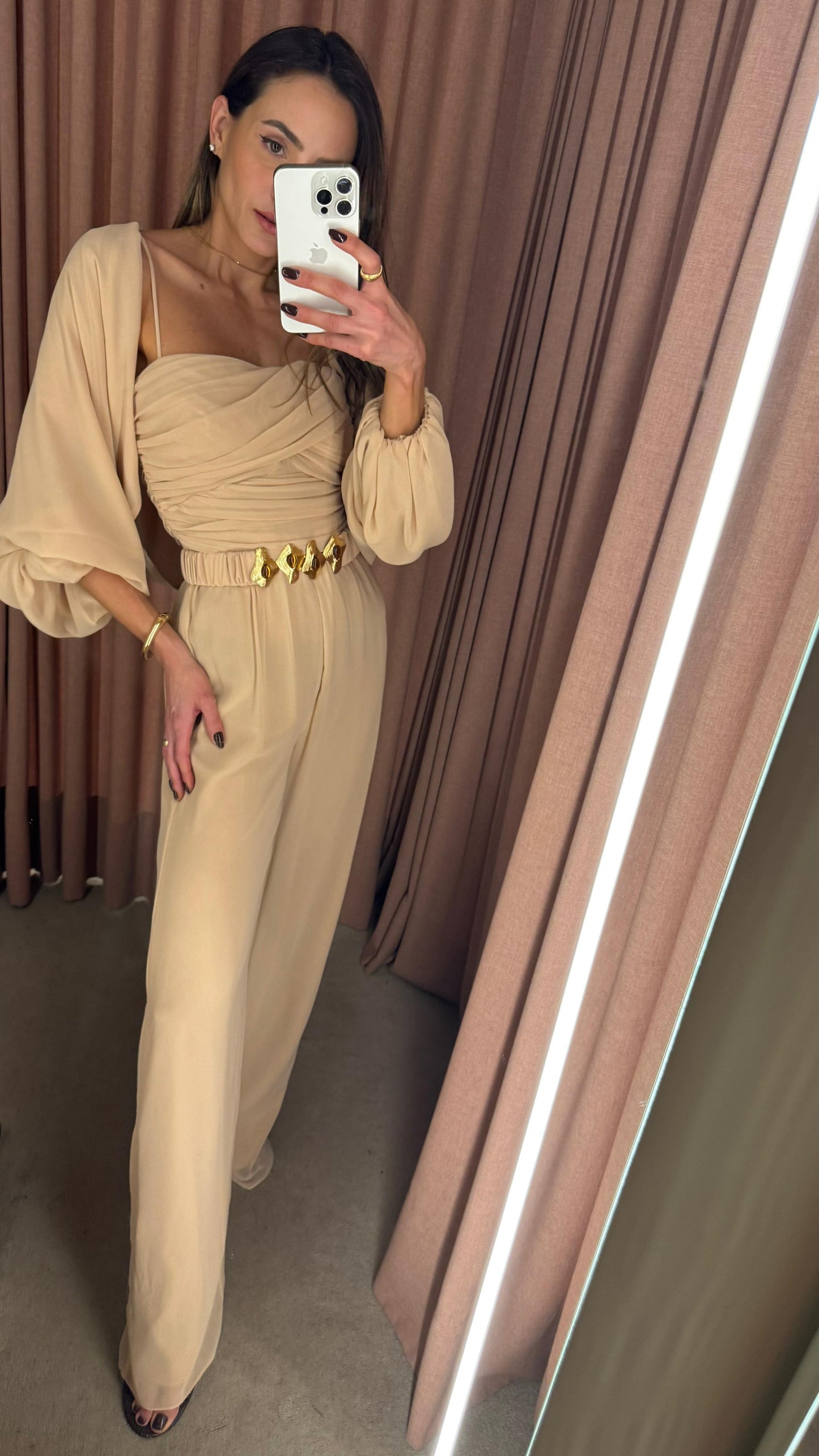 A elegância se manifesta em cada detalhe deste macacão em crepe Saad, que une conforto, estilo e exclusividade em uma única peça versátil e atemporal. Com modelagem fluida e calça reta, ele conta com elástico na cintura para um caimento impecável e liberdade de movimento. O busto apresenta um delicado drapeado que valoriza a silhueta, enquanto as alças finas trazem feminilidade e leveza. Para arrematar, o casaco solto com mangas amplas e punhos em elástico adiciona um toque contemporâneo ao look. O destaque fica por conta do cinto exclusivo, forrado no mesmo tecido e com fivela diferenciada, que marca a cintura com sofisticação e reforça a identidade única da peça. Perfeito para transitar entre ocasiões com estilo e praticidade – do compromisso casual ao evento elegante, com apenas uma troca de acessórios.