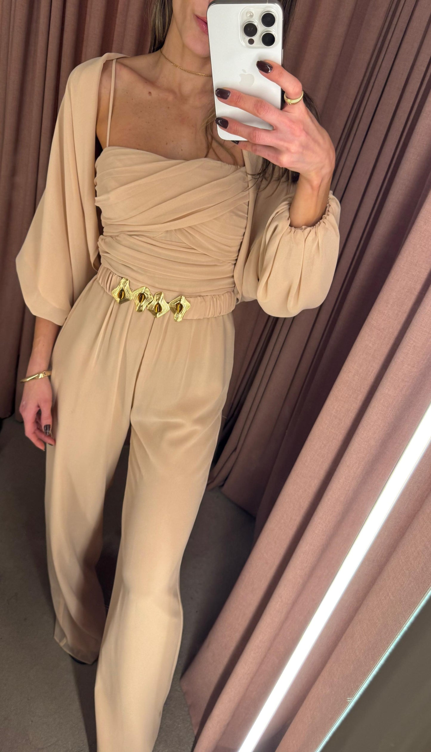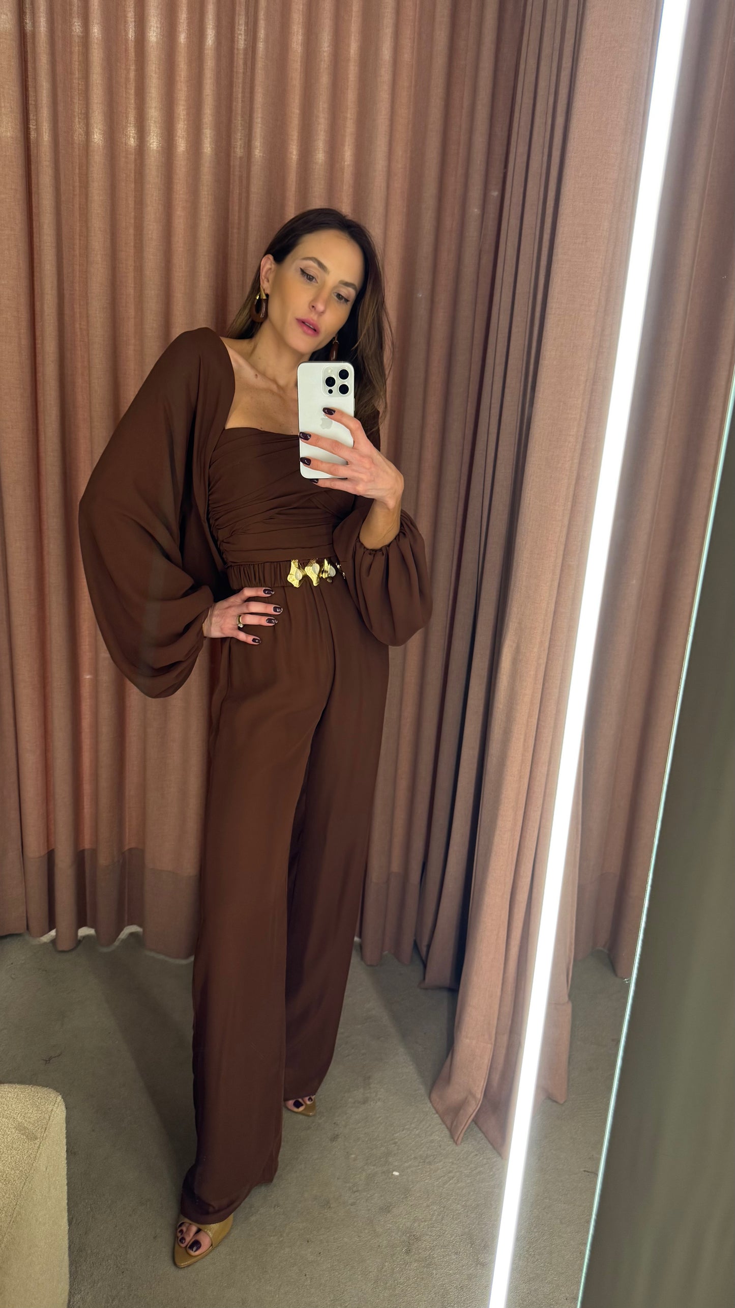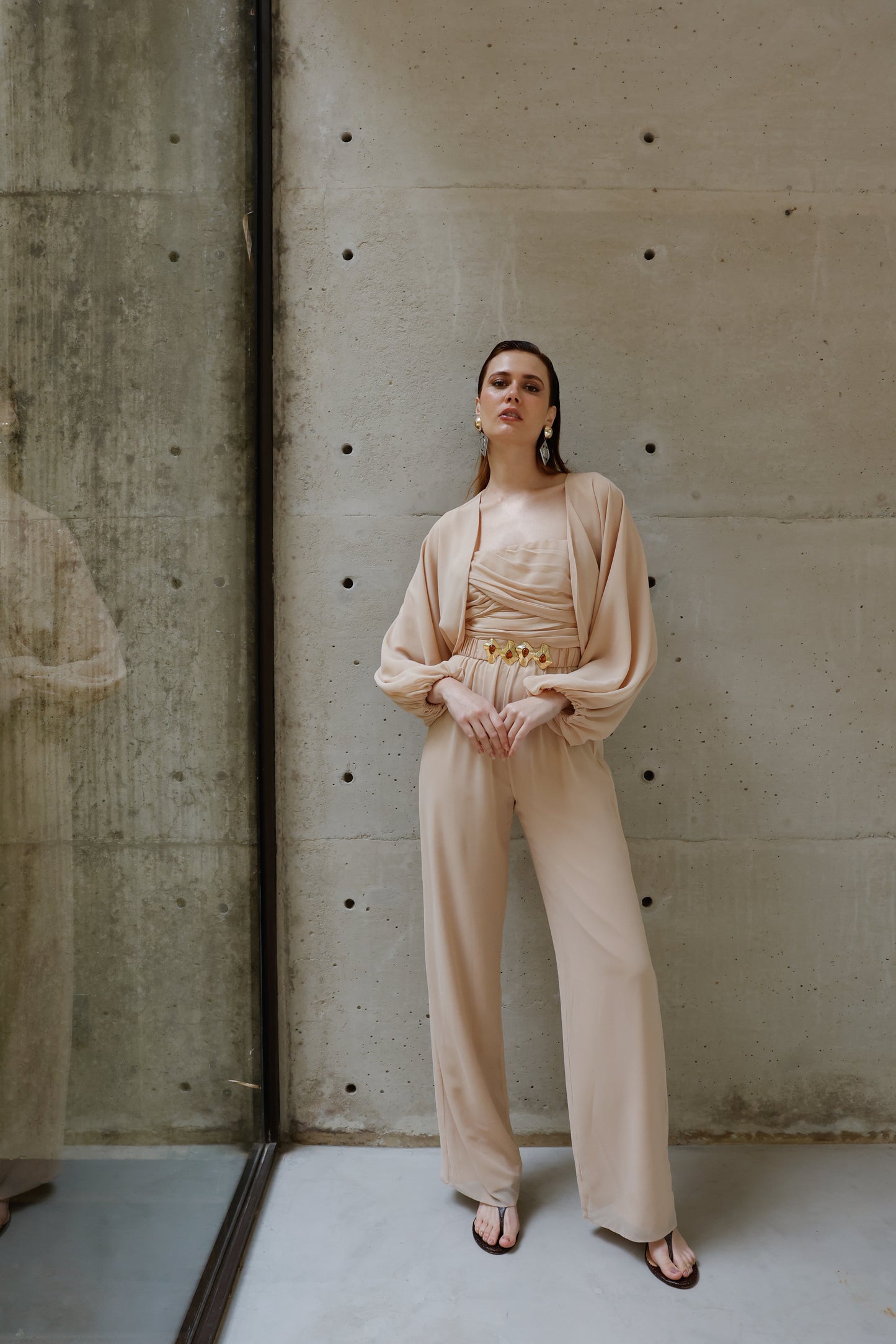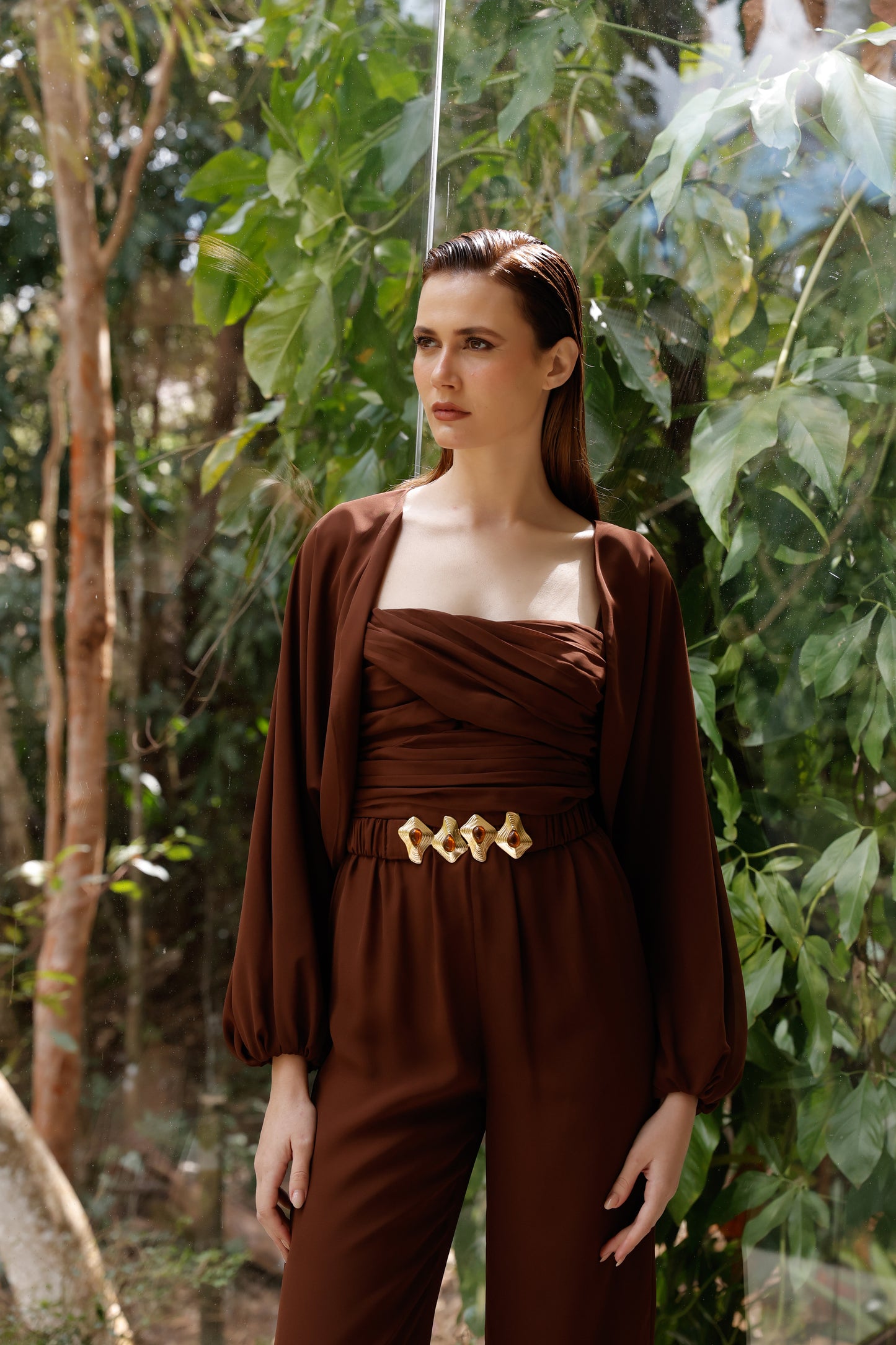 A elegância se manifesta em cada detalhe deste macacão em crepe Saad, que une conforto, estilo e exclusividade em uma única peça versátil e atemporal. Com modelagem fluida e calça reta, ele conta com elástico na cintura para um caimento impecável e liberdade de movimento. O busto apresenta um delicado drapeado que valoriza a silhueta, enquanto as alças finas trazem feminilidade e leveza. Para arrematar, o casaco solto com mangas amplas e punhos em elástico adiciona um toque contemporâneo ao look. O destaque fica por conta do cinto exclusivo, forrado no mesmo tecido e com fivela diferenciada, que marca a cintura com sofisticação e reforça a identidade única da peça. Perfeito para transitar entre ocasiões com estilo e praticidade – do compromisso casual ao evento elegante, com apenas uma troca de acessórios.