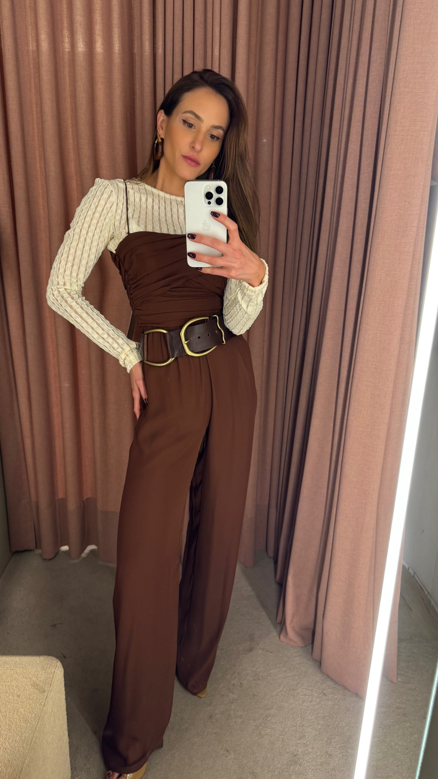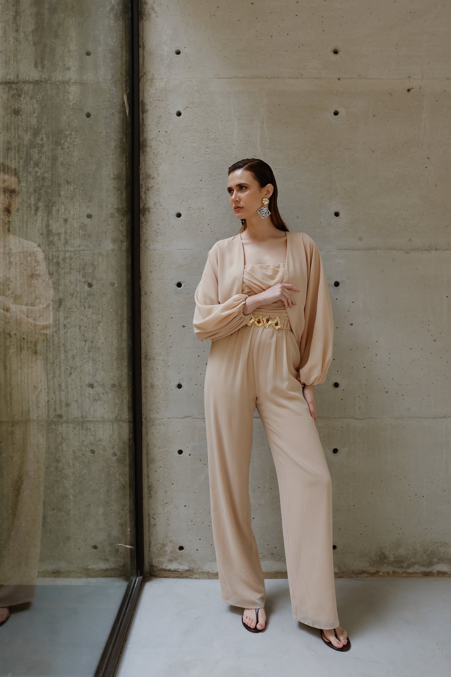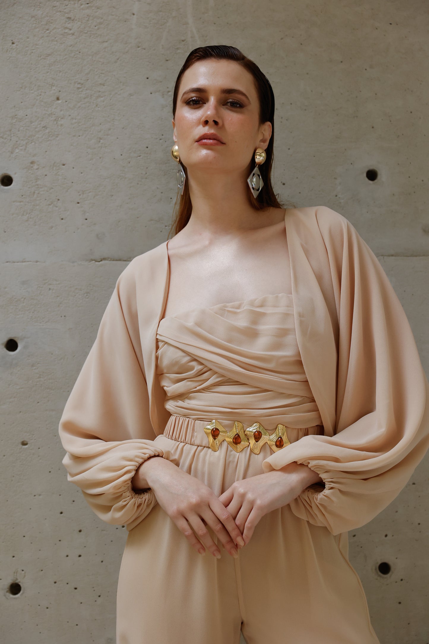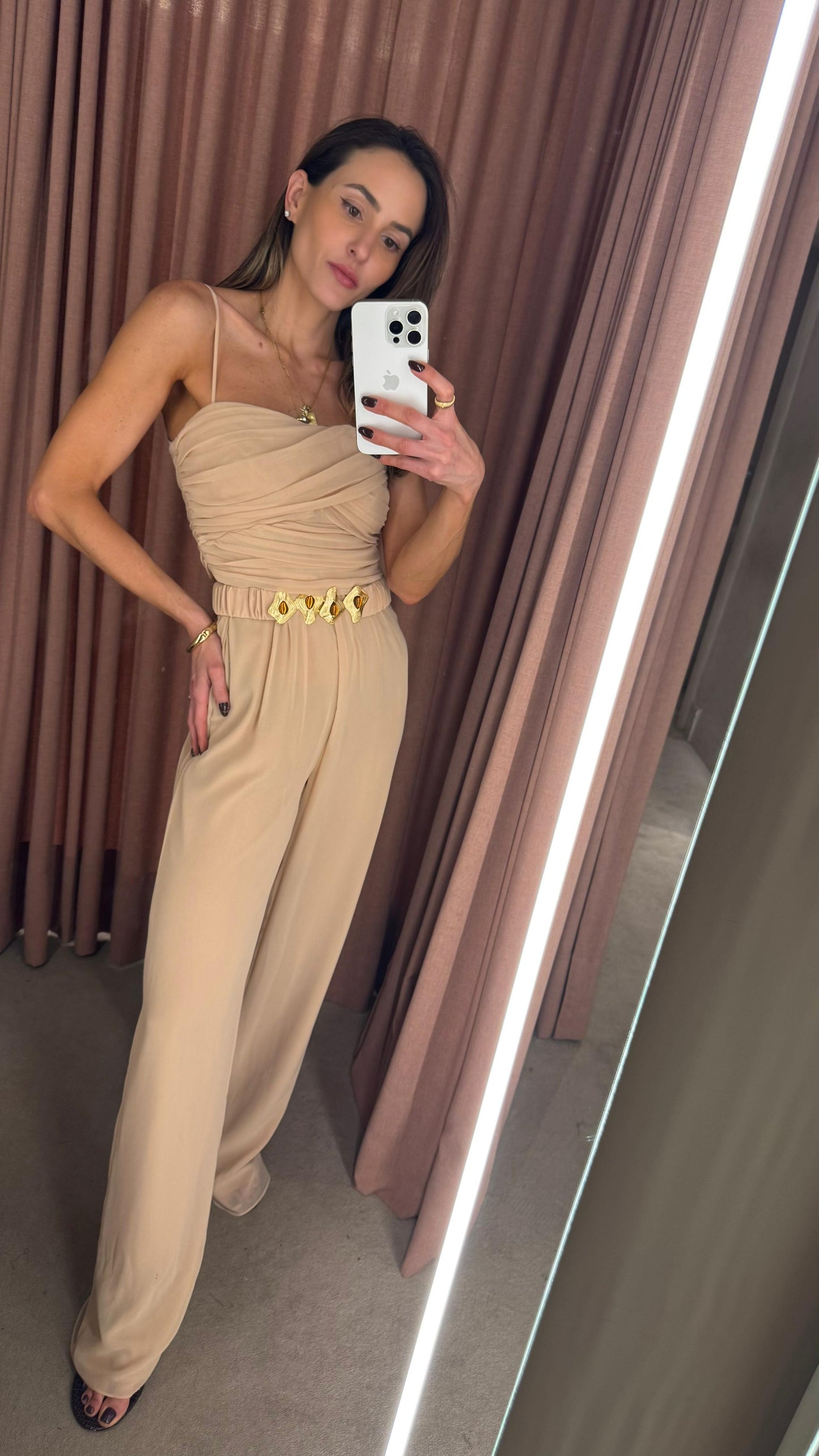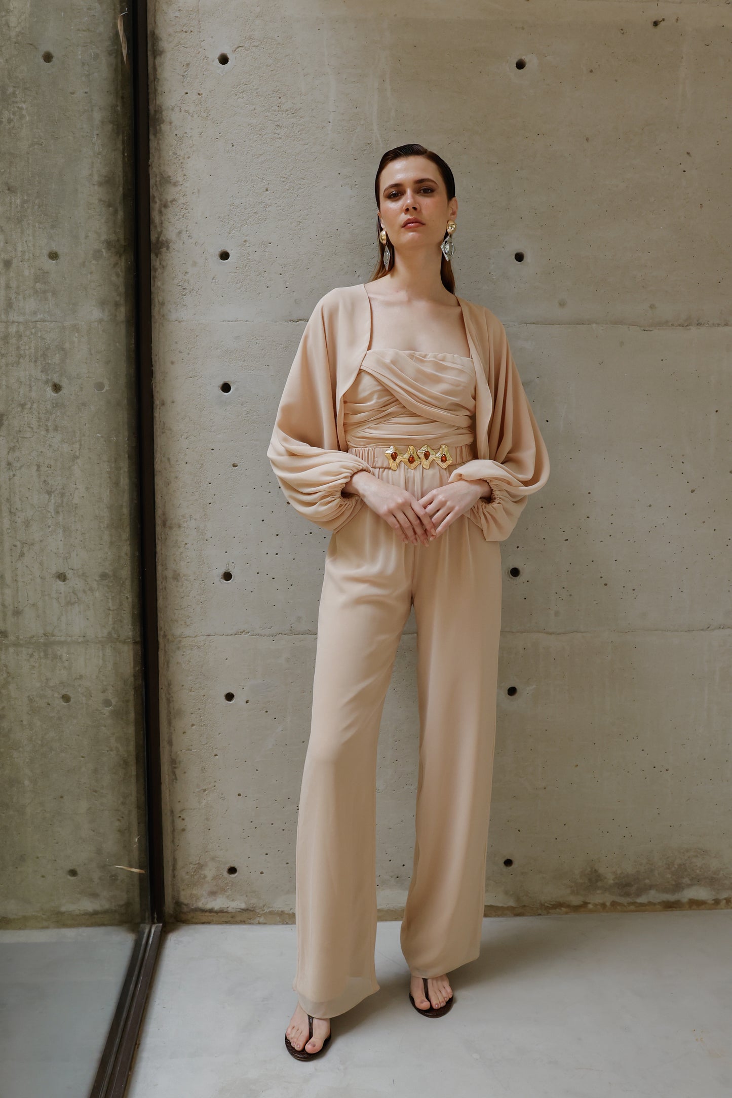 A elegância se manifesta em cada detalhe deste macacão em crepe Saad, que une conforto, estilo e exclusividade em uma única peça versátil e atemporal. Com modelagem fluida e calça reta, ele conta com elástico na cintura para um caimento impecável e liberdade de movimento. O busto apresenta um delicado drapeado que valoriza a silhueta, enquanto as alças finas trazem feminilidade e leveza. Para arrematar, o casaco solto com mangas amplas e punhos em elástico adiciona um toque contemporâneo ao look. O destaque fica por conta do cinto exclusivo, forrado no mesmo tecido e com fivela diferenciada, que marca a cintura com sofisticação e reforça a identidade única da peça. Perfeito para transitar entre ocasiões com estilo e praticidade – do compromisso casual ao evento elegante, com apenas uma troca de acessórios.