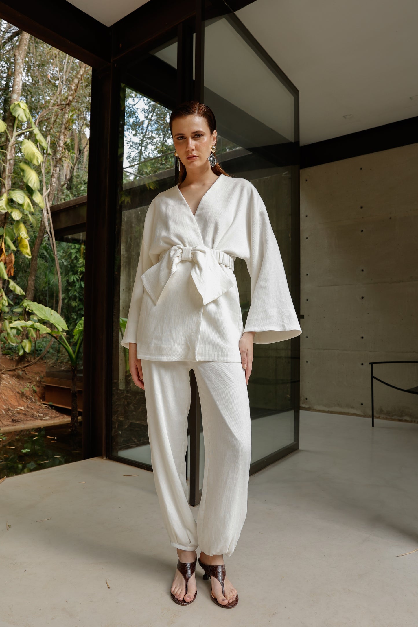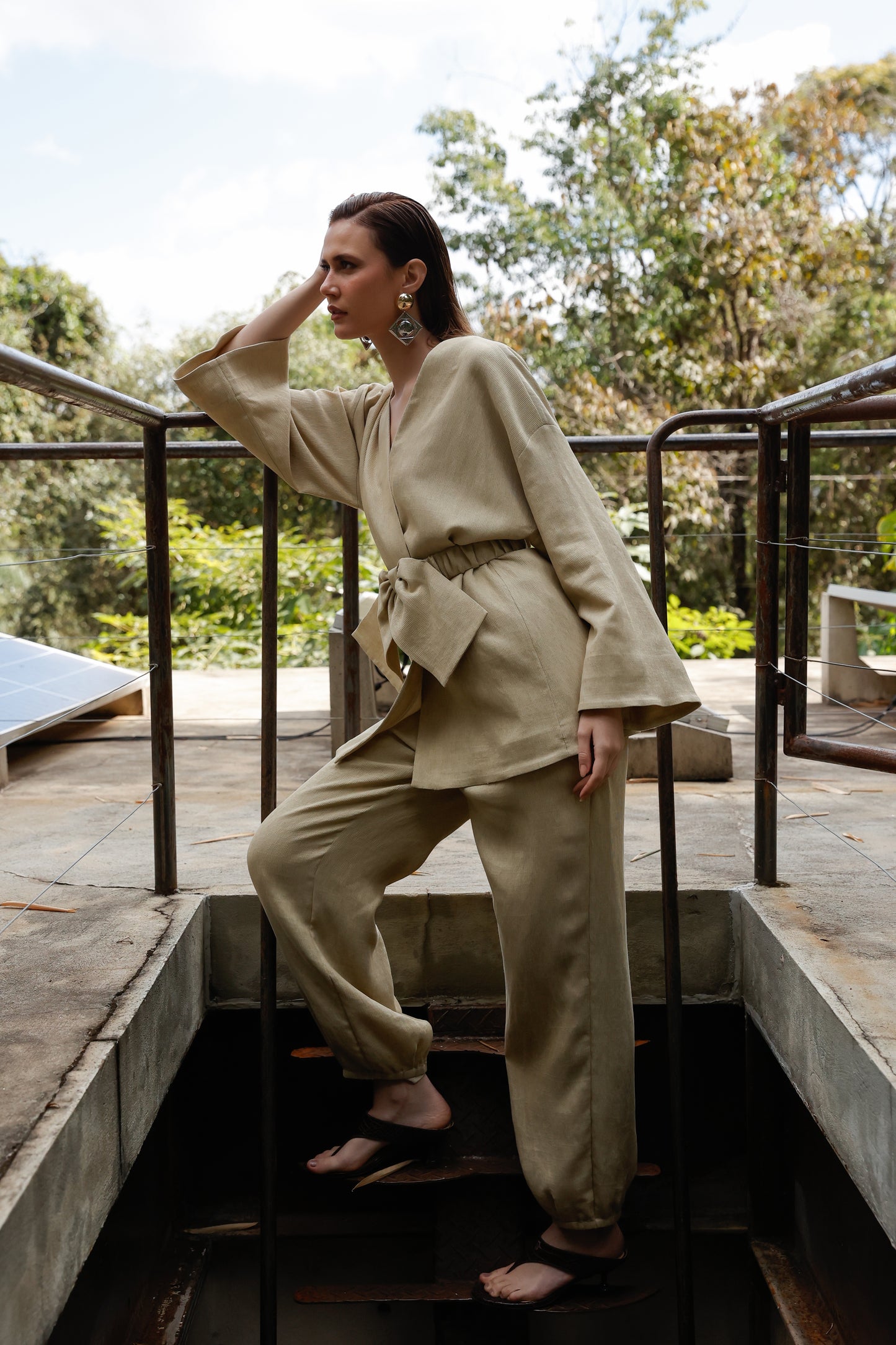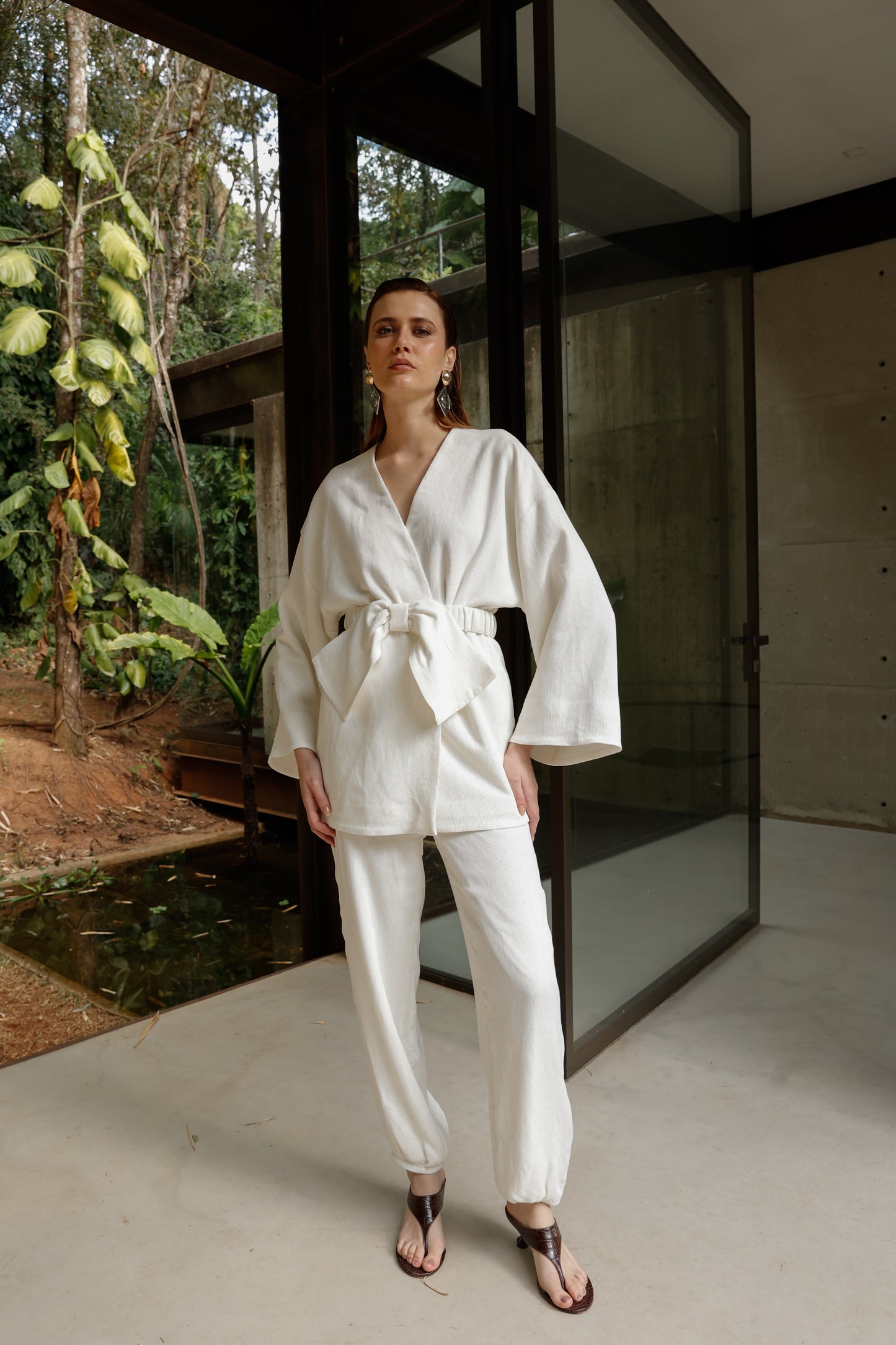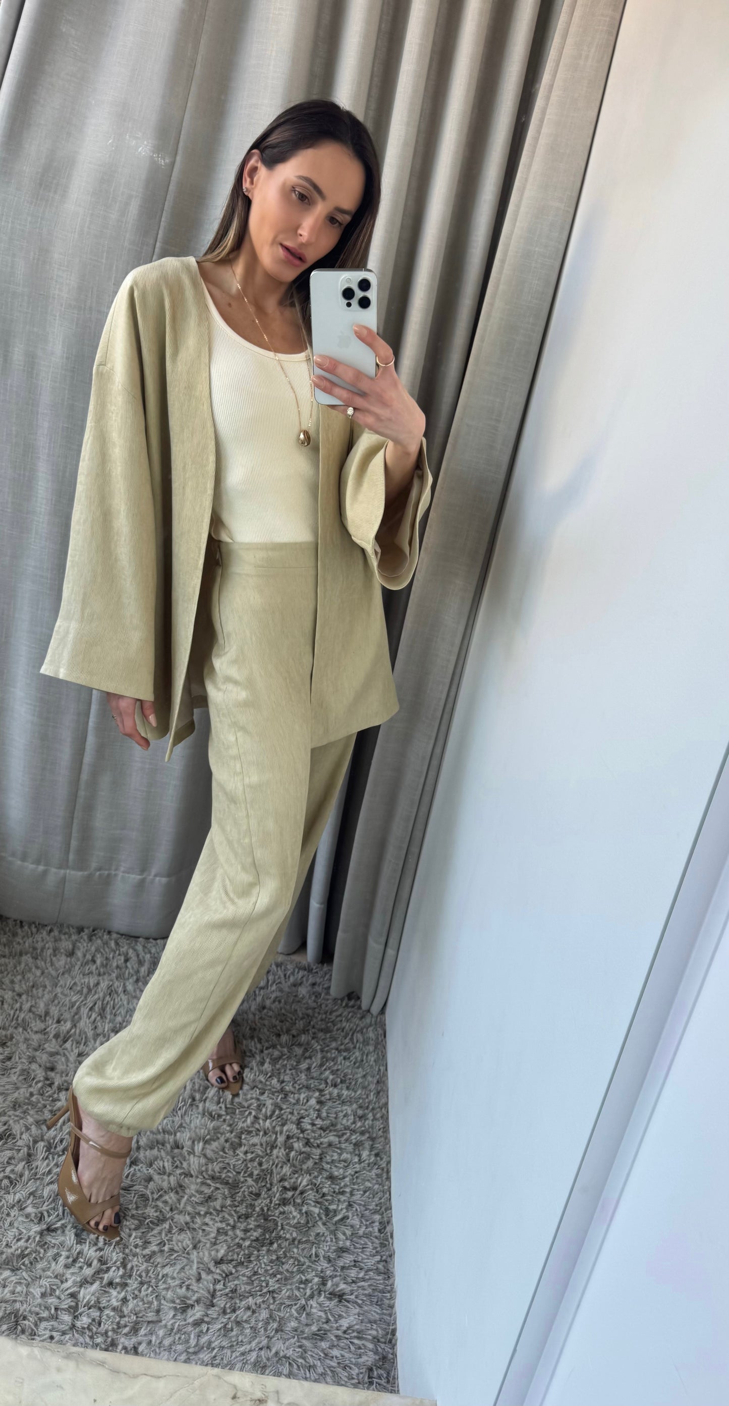 Conjunto elegante composto por kimono de mangas soltas e calça de corte reto. O kimono vem acompanhado de cinto no mesmo tom para acinturar a silhueta com leveza, permitindo diferentes formas de uso — aberto, solto ou marcado na cintura. A calça traz um caimento fluido e sofisticado, com cintura média e acabamento impecável, perfeita para transitar com naturalidade entre o casual chic e o refinado.