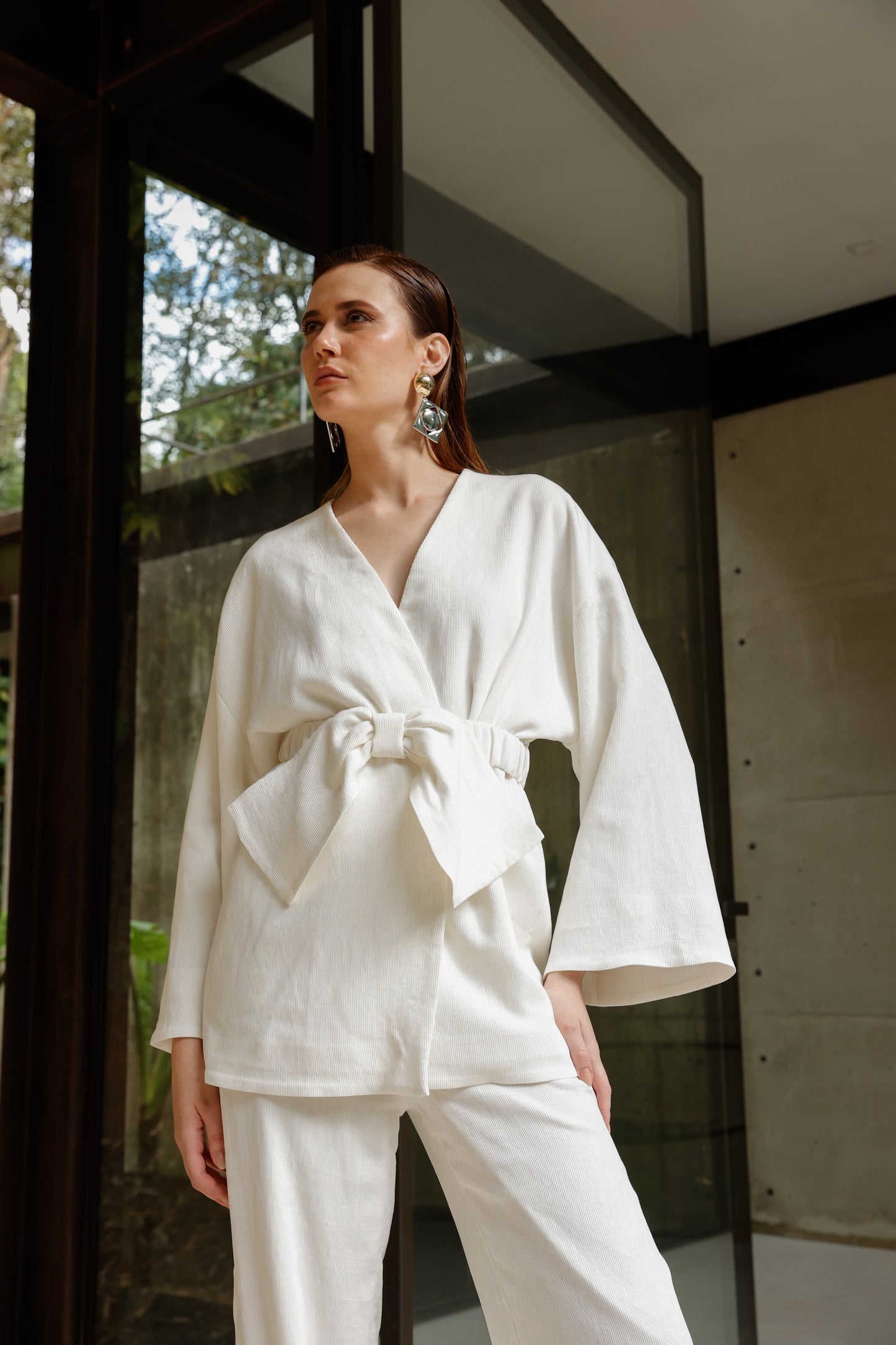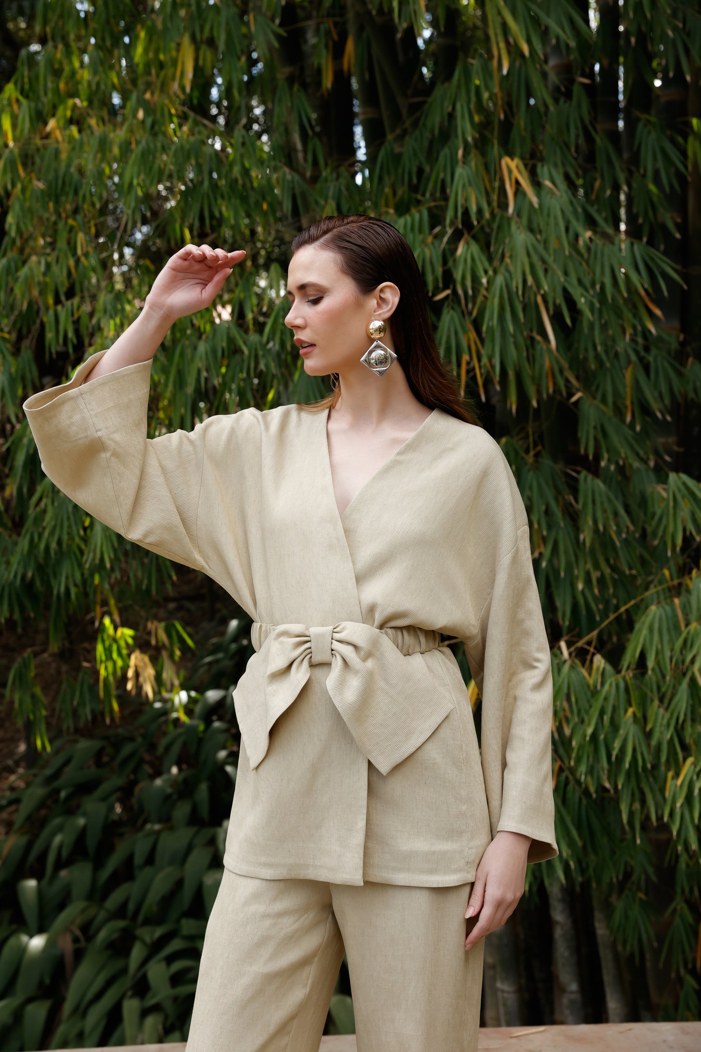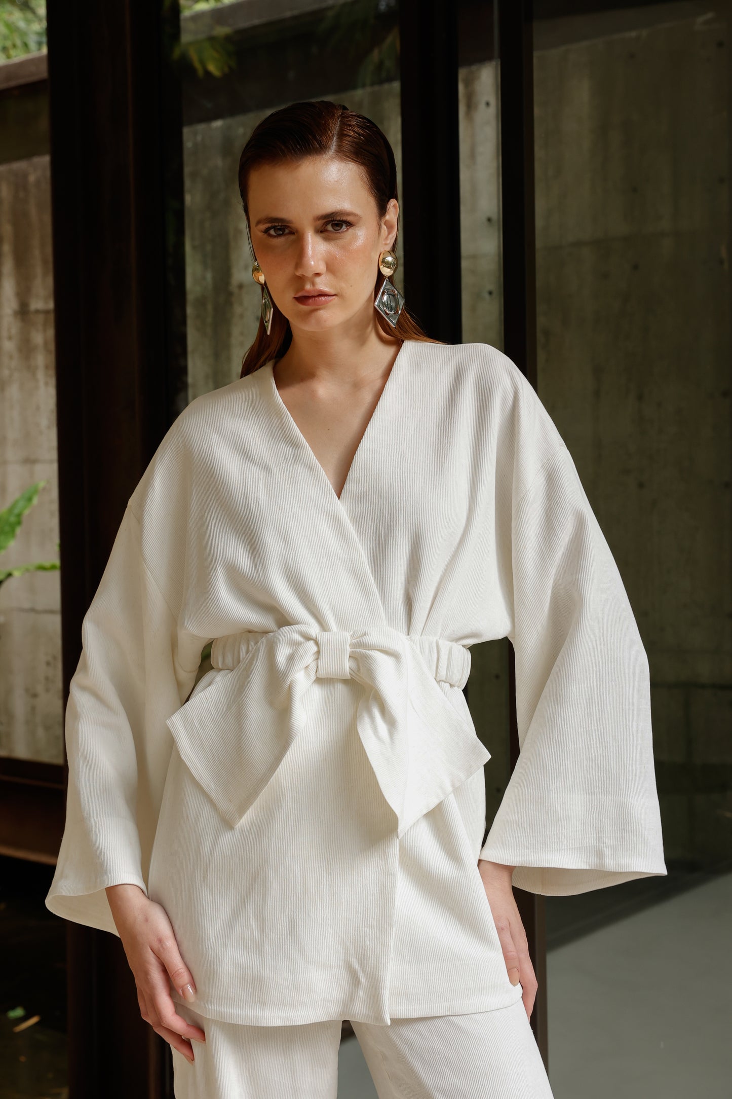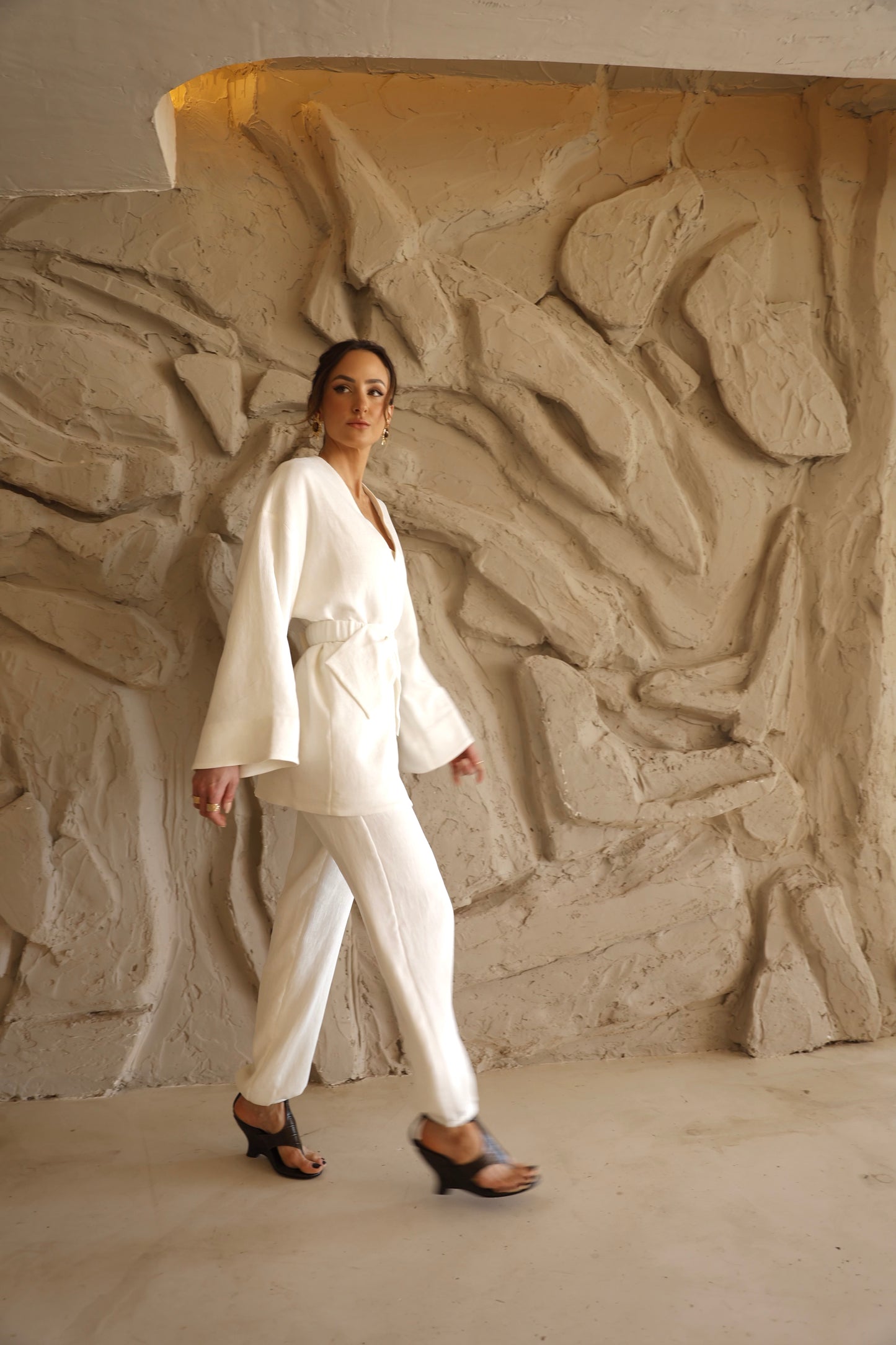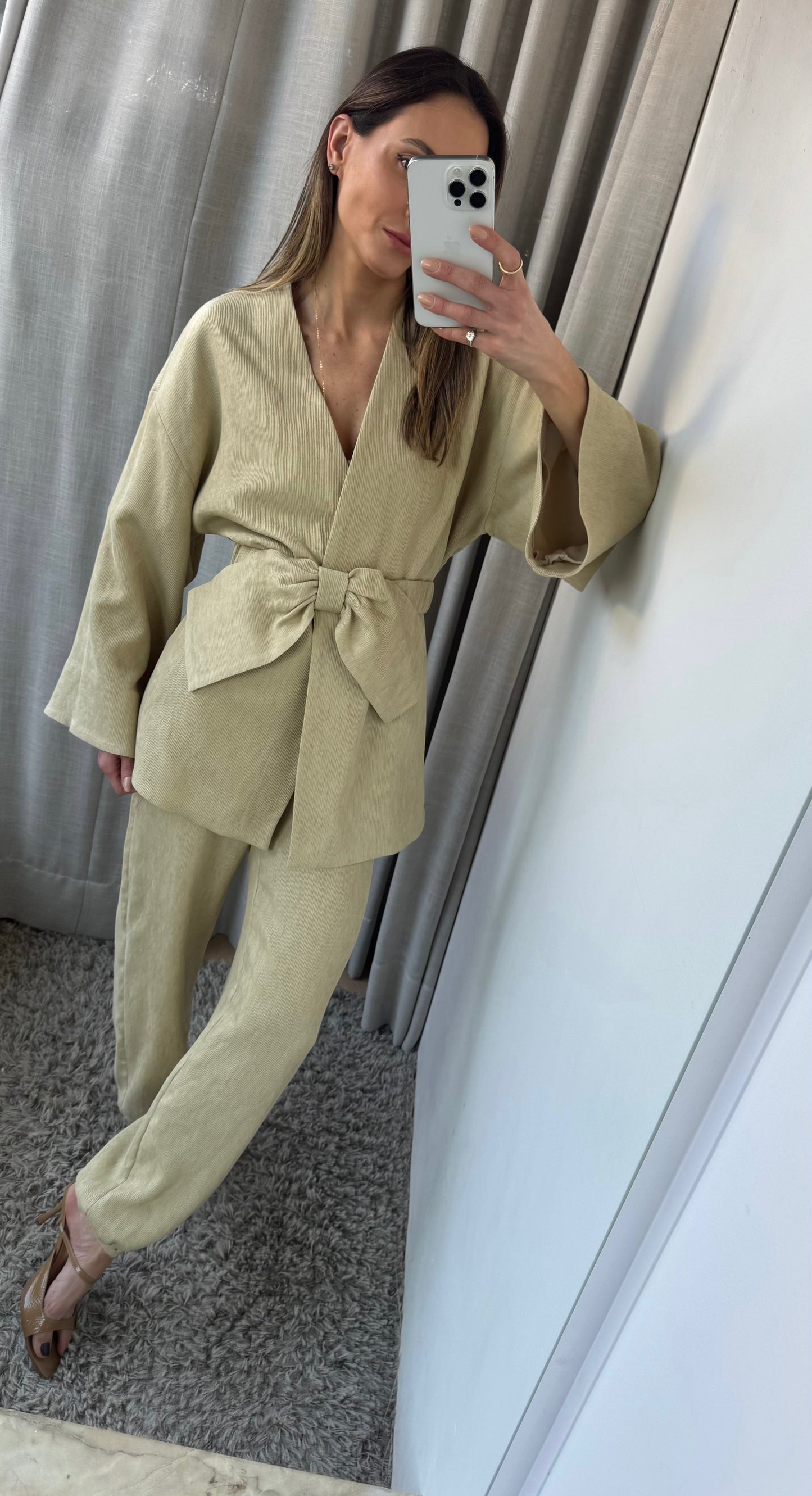 Conjunto elegante composto por kimono de mangas soltas e calça de corte reto. O kimono vem acompanhado de cinto no mesmo tom para acinturar a silhueta com leveza, permitindo diferentes formas de uso — aberto, solto ou marcado na cintura. A calça traz um caimento fluido e sofisticado, com cintura média e acabamento impecável, perfeita para transitar com naturalidade entre o casual chic e o refinado.