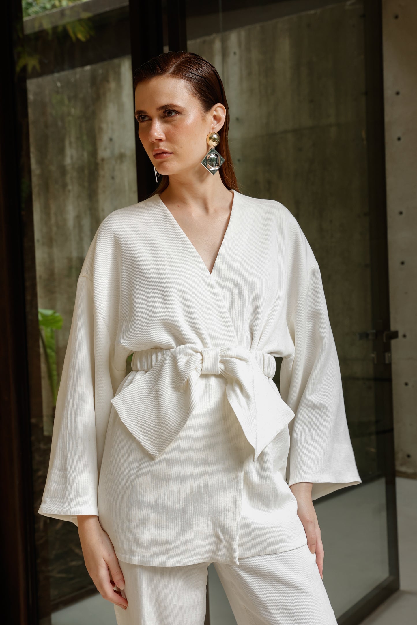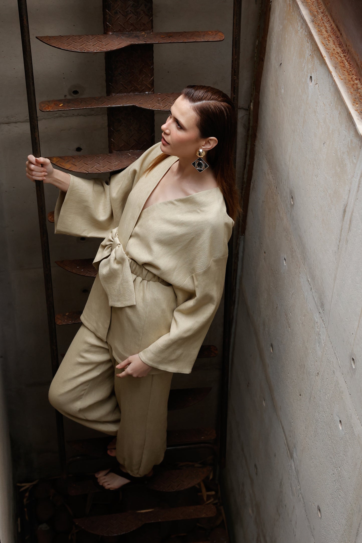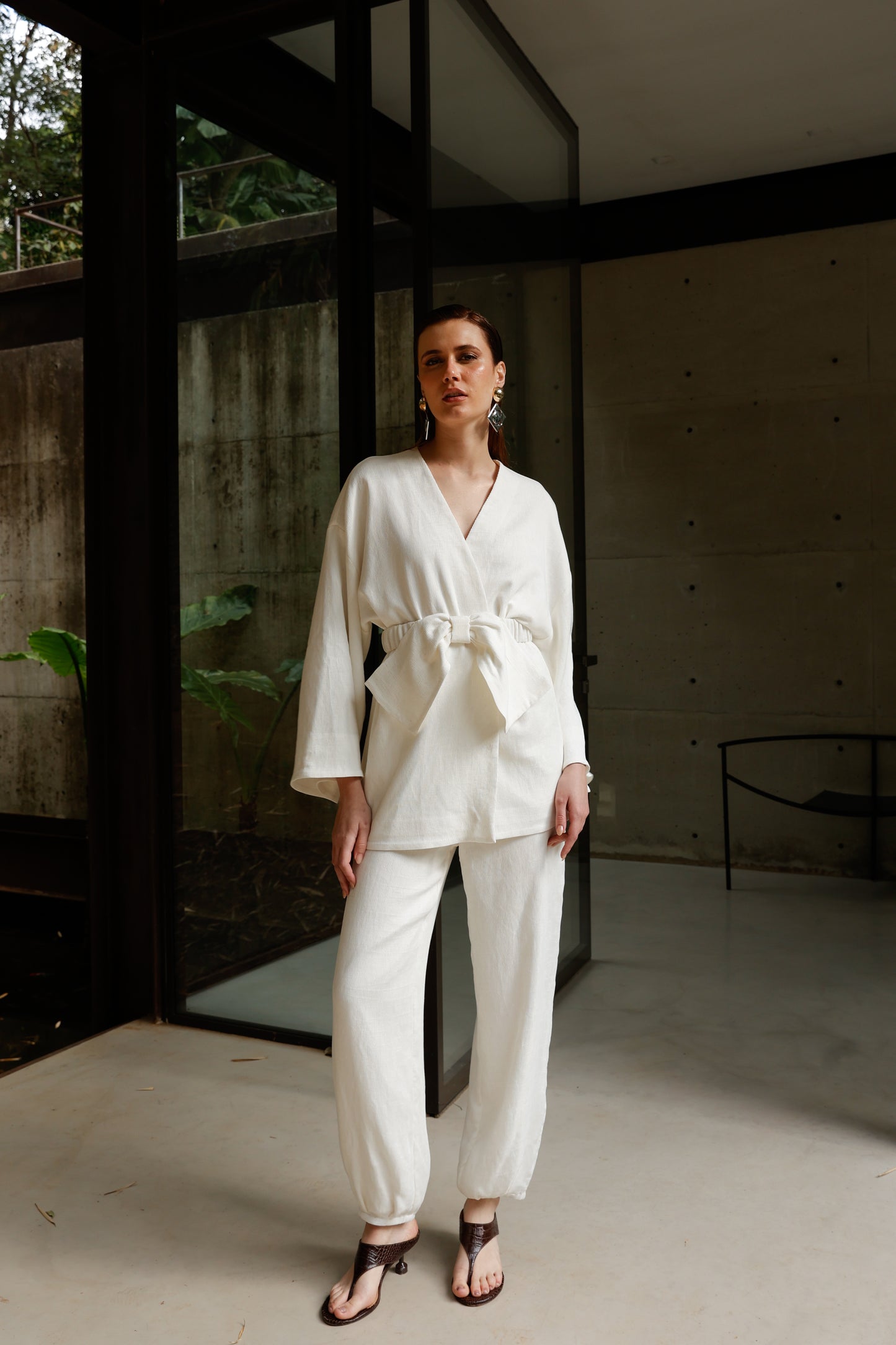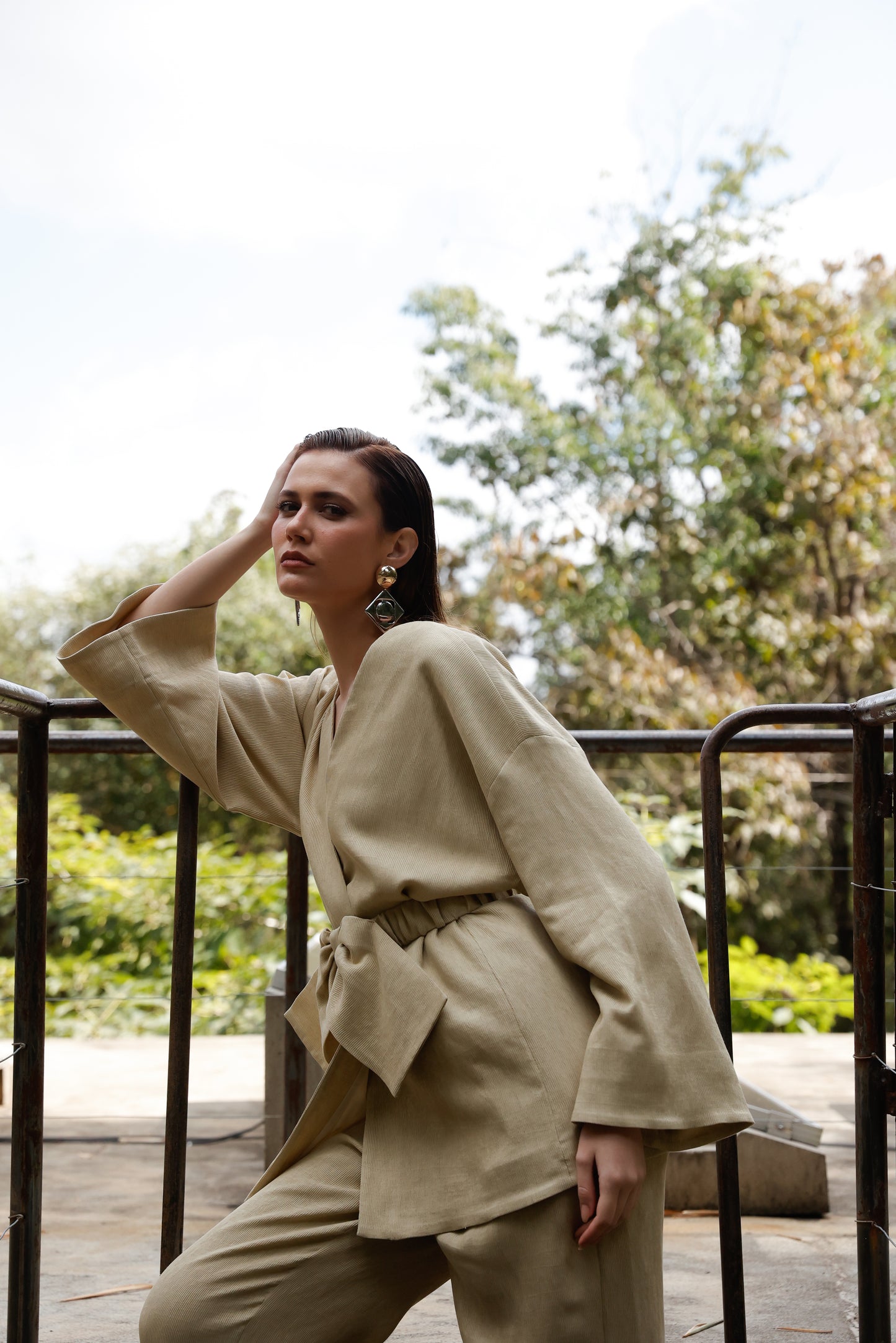 Conjunto elegante composto por kimono de mangas soltas e calça de corte reto. O kimono vem acompanhado de cinto no mesmo tom para acinturar a silhueta com leveza, permitindo diferentes formas de uso — aberto, solto ou marcado na cintura. A calça traz um caimento fluido e sofisticado, com cintura média e acabamento impecável, perfeita para transitar com naturalidade entre o casual chic e o refinado.