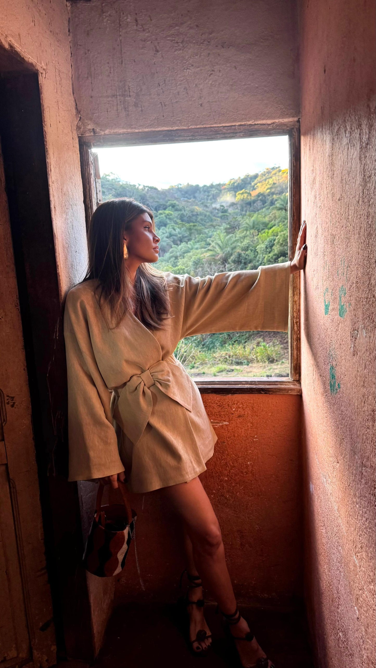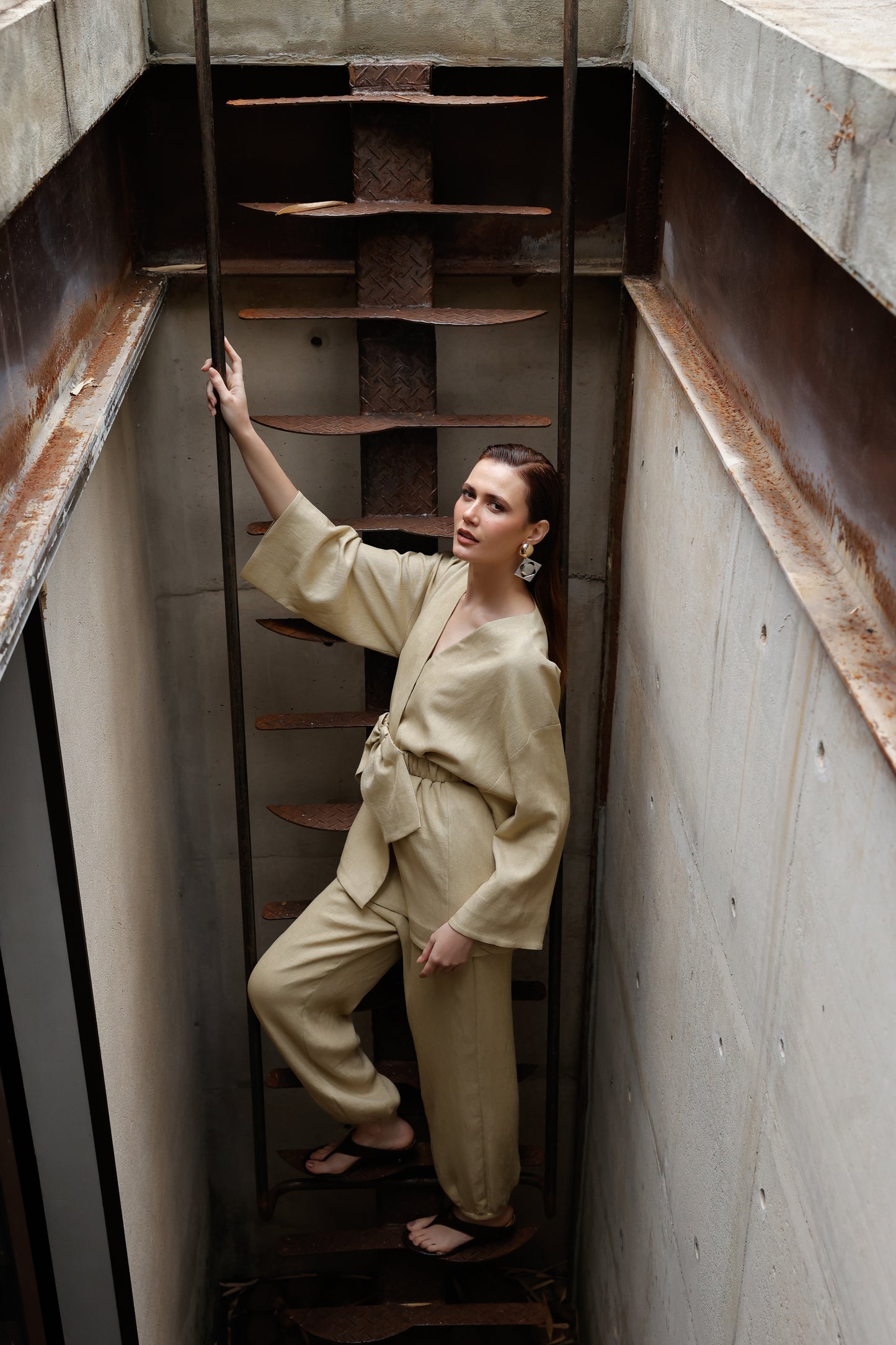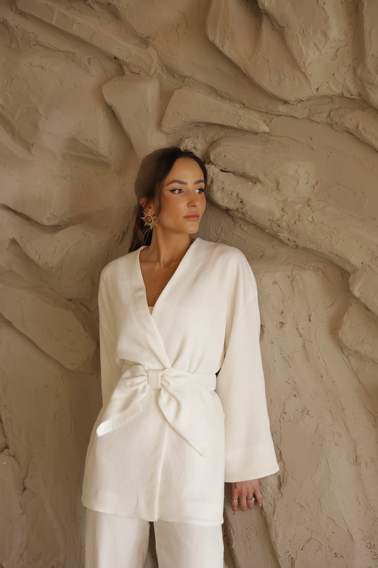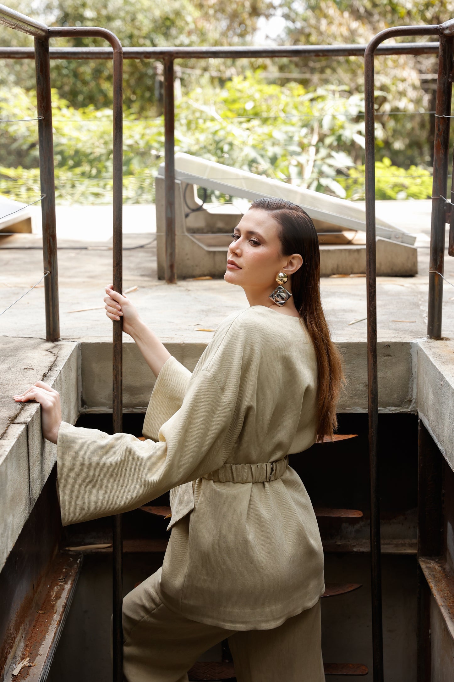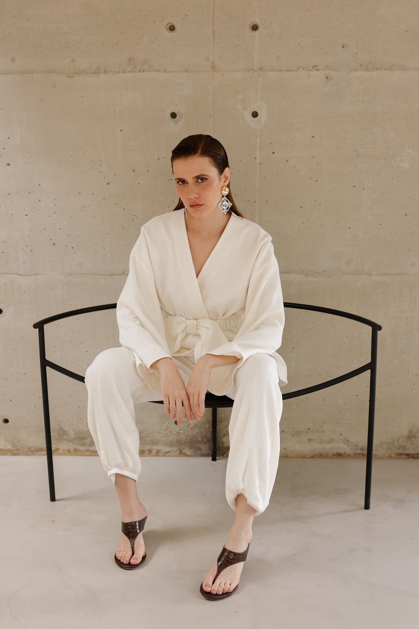 Conjunto elegante composto por kimono de mangas soltas e calça de corte reto. O kimono vem acompanhado de cinto no mesmo tom para acinturar a silhueta com leveza, permitindo diferentes formas de uso — aberto, solto ou marcado na cintura. A calça traz um caimento fluido e sofisticado, com cintura média e acabamento impecável, perfeita para transitar com naturalidade entre o casual chic e o refinado.