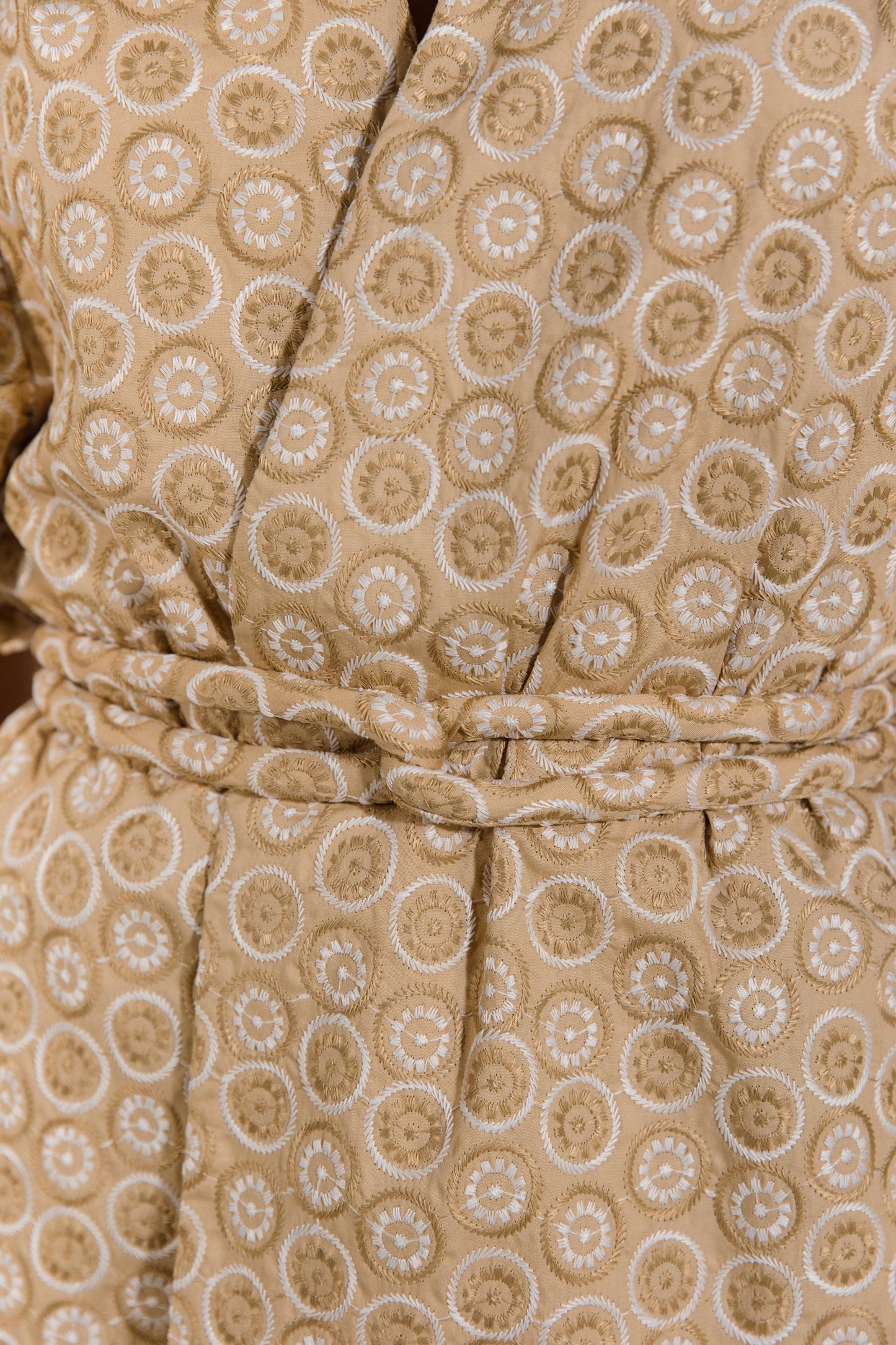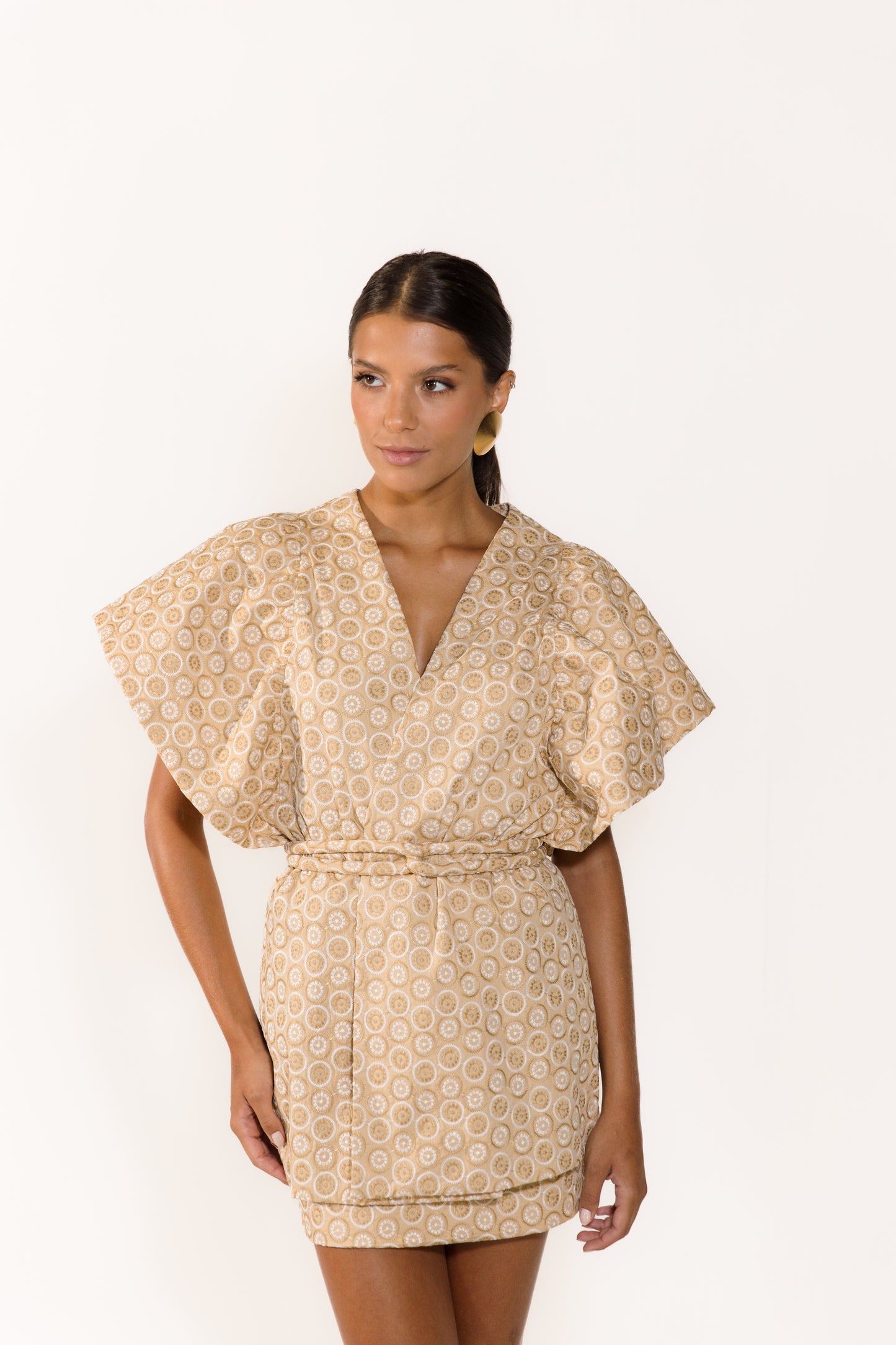 Conjunto em jacquard preto com textura floral sutil e sofisticada, composto por saia reta e kimono de mangas amplas que exala elegância contemporânea. A peça superior ganha estrutura e charme com o decote em V e é finalizada por um cordão do próprio tecido, que acintura a silhueta com delicadeza e precisão. O brilho discreto do jacquard confere um toque de luxo atemporal, ideal para produções marcantes que equilibram sofisticação e modernidade.