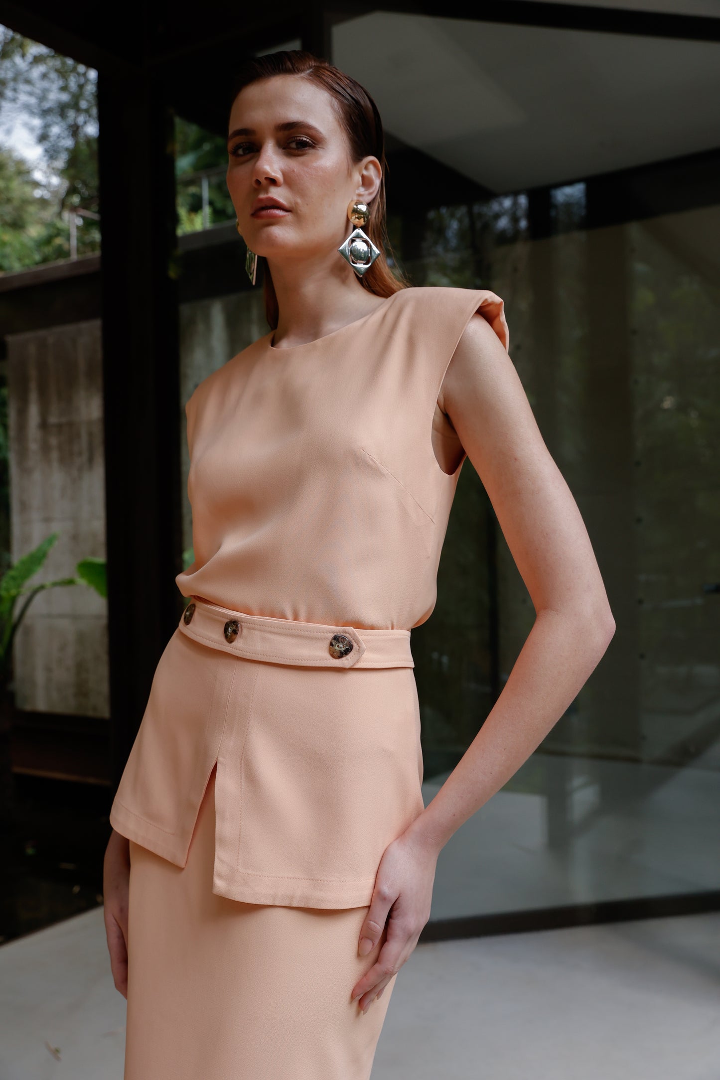 Preço regular R$ 398,40Minimalismo com presença marcante. Esta blusa sem mangas, em crepe leve, aposta na estrutura das ombreiras para um visual poderoso e contemporâneo. O comprimento mais curto valoriza a cintura, alinhando-se perfeitamente ao cós da calça. Nas costas, o delicado botão com argola confere um charme funcional e discreto. Uma peça-chave para looks elegantes com atitude.