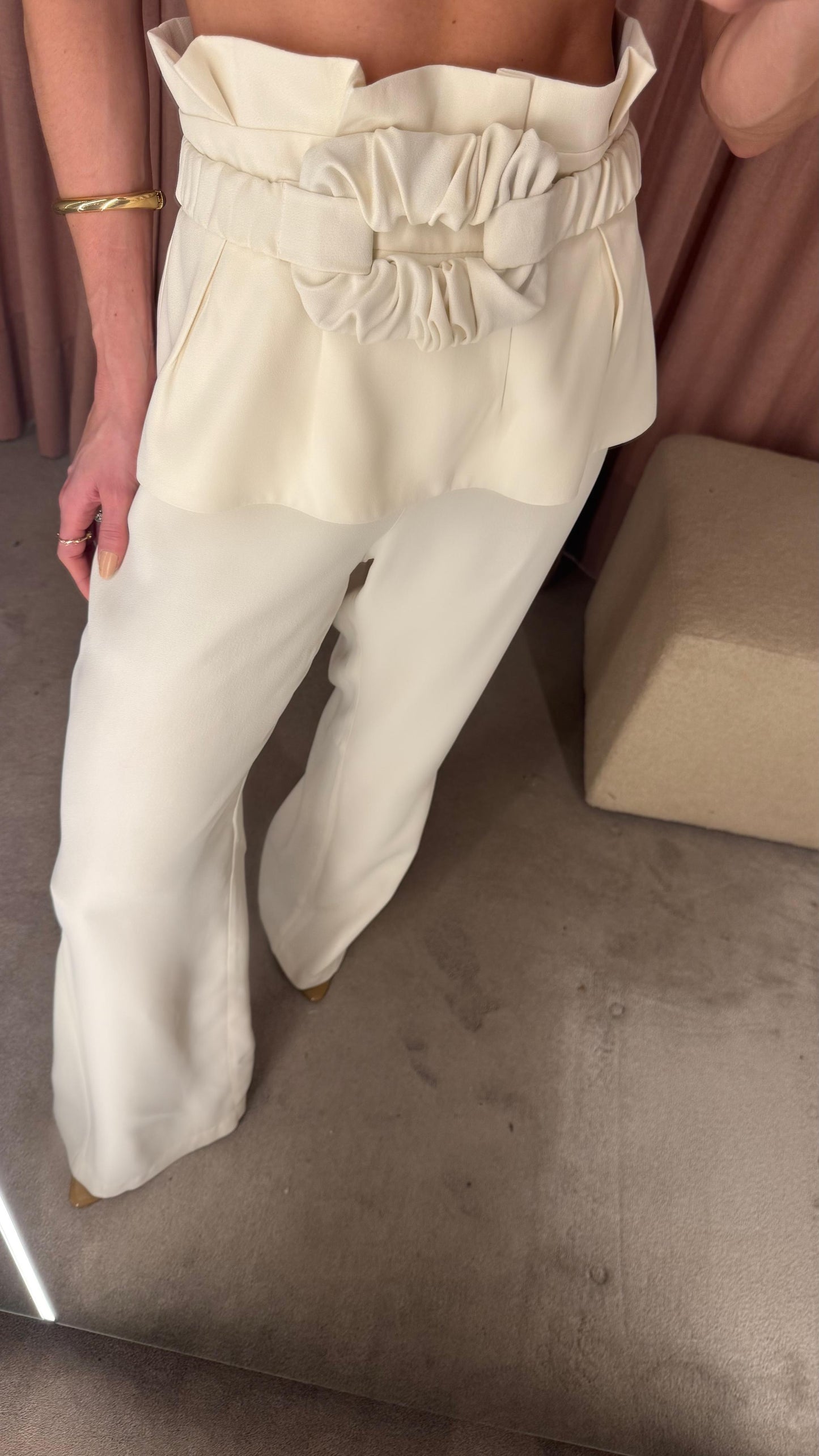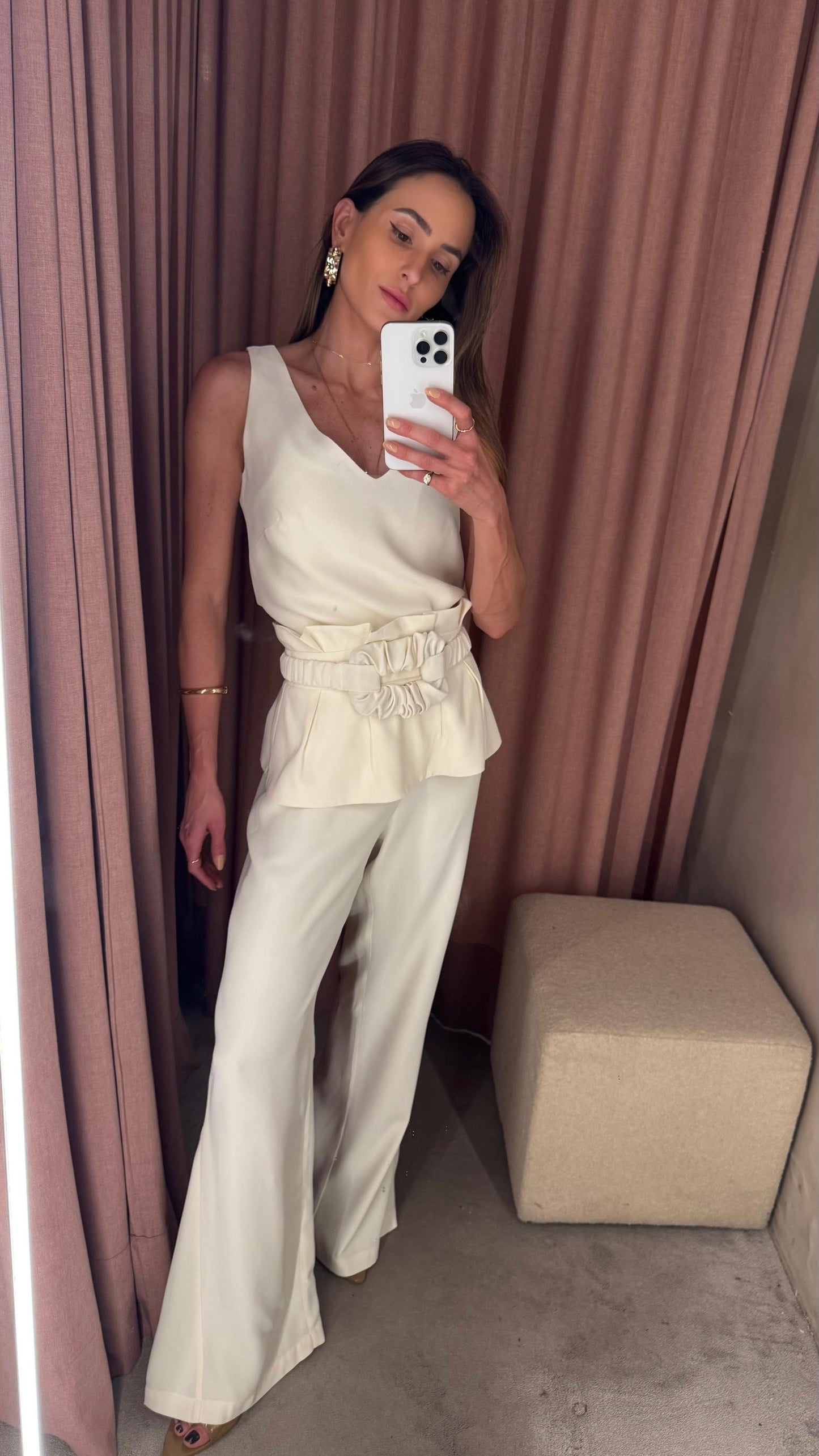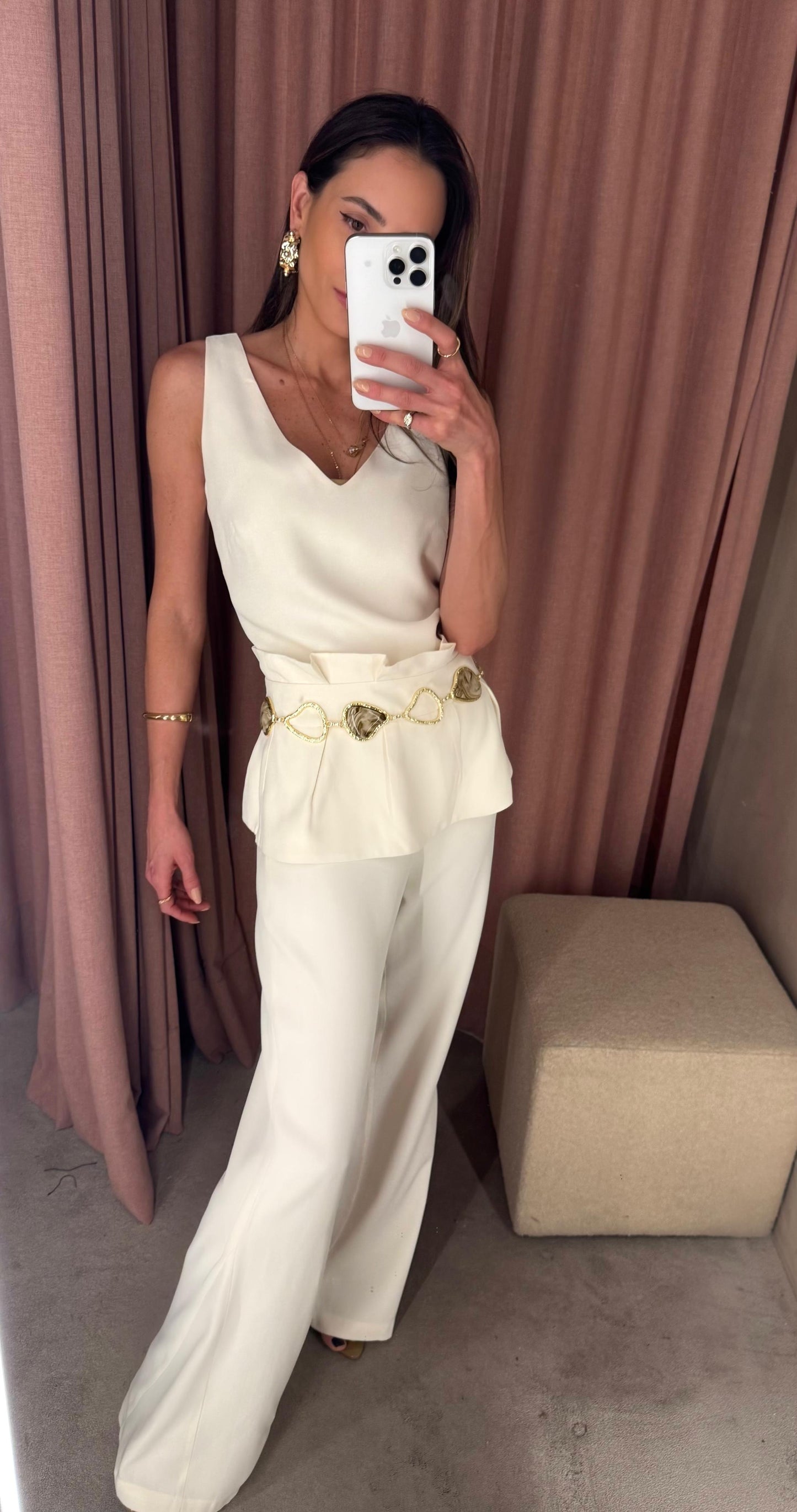 Uma peça que une estrutura e fluidez de forma impecável. Esta calça off-white apresenta uma proposta refinada com sobreposição peplum na cintura, criando uma silhueta feminina e elegante, ideal para looks sofisticados com personalidade. O destaque fica por conta do cinto forrado no mesmo tecido, com fivela retangular encapada, que proporciona um acabamento monocromático clean e ultra chic. A modelagem reta e alongada valoriza o corpo com caimento fluido, ideal para composições minimalistas e contemporâneas. Versátil, vai do office ao evento com facilidade — combine com tops estruturados ou camisas de seda para elevar ainda mais o visual.