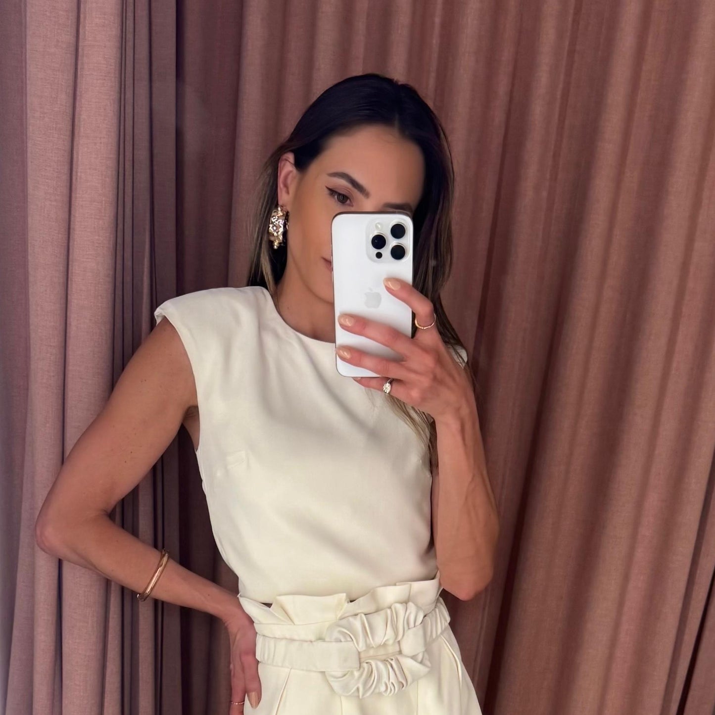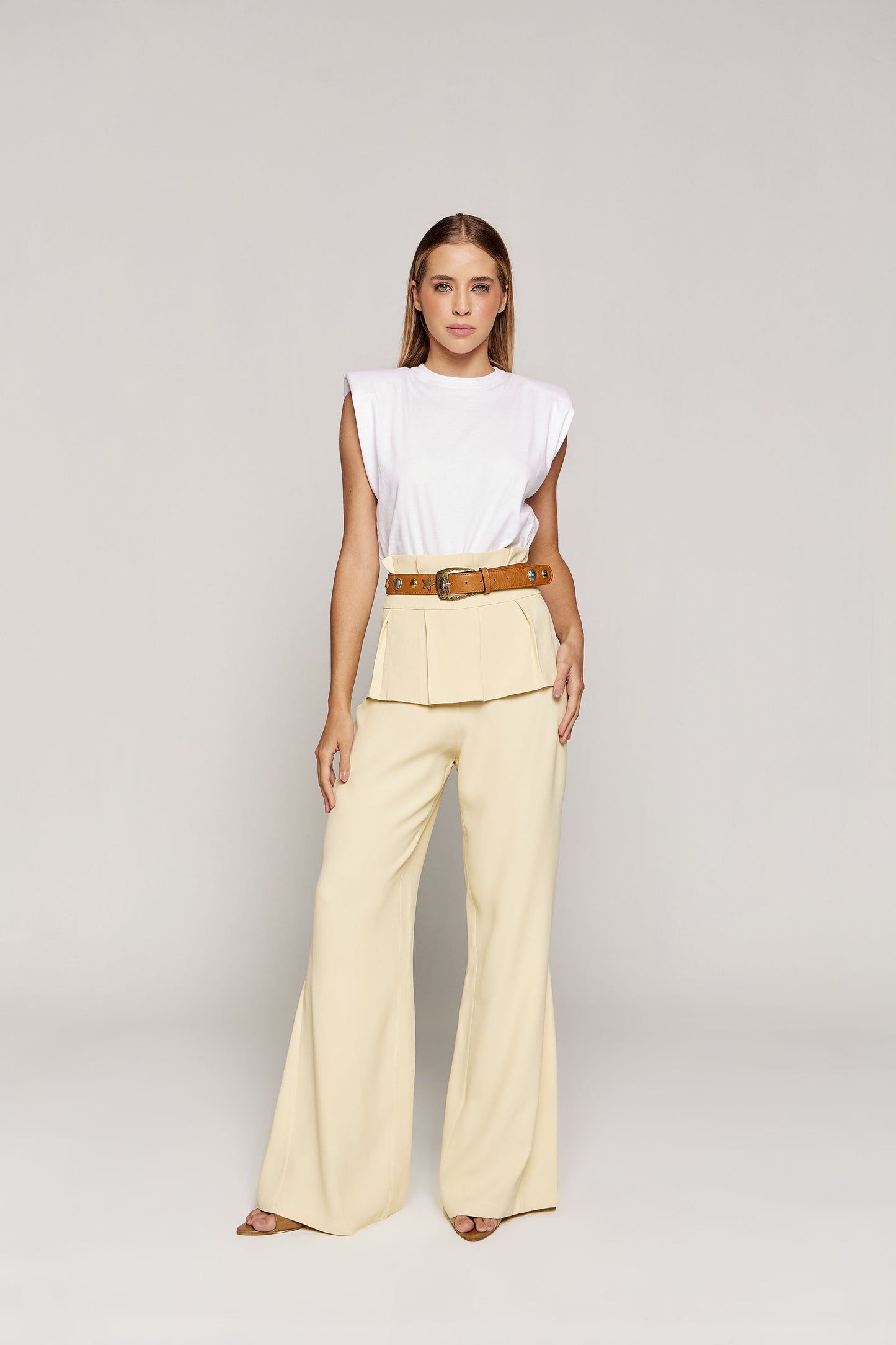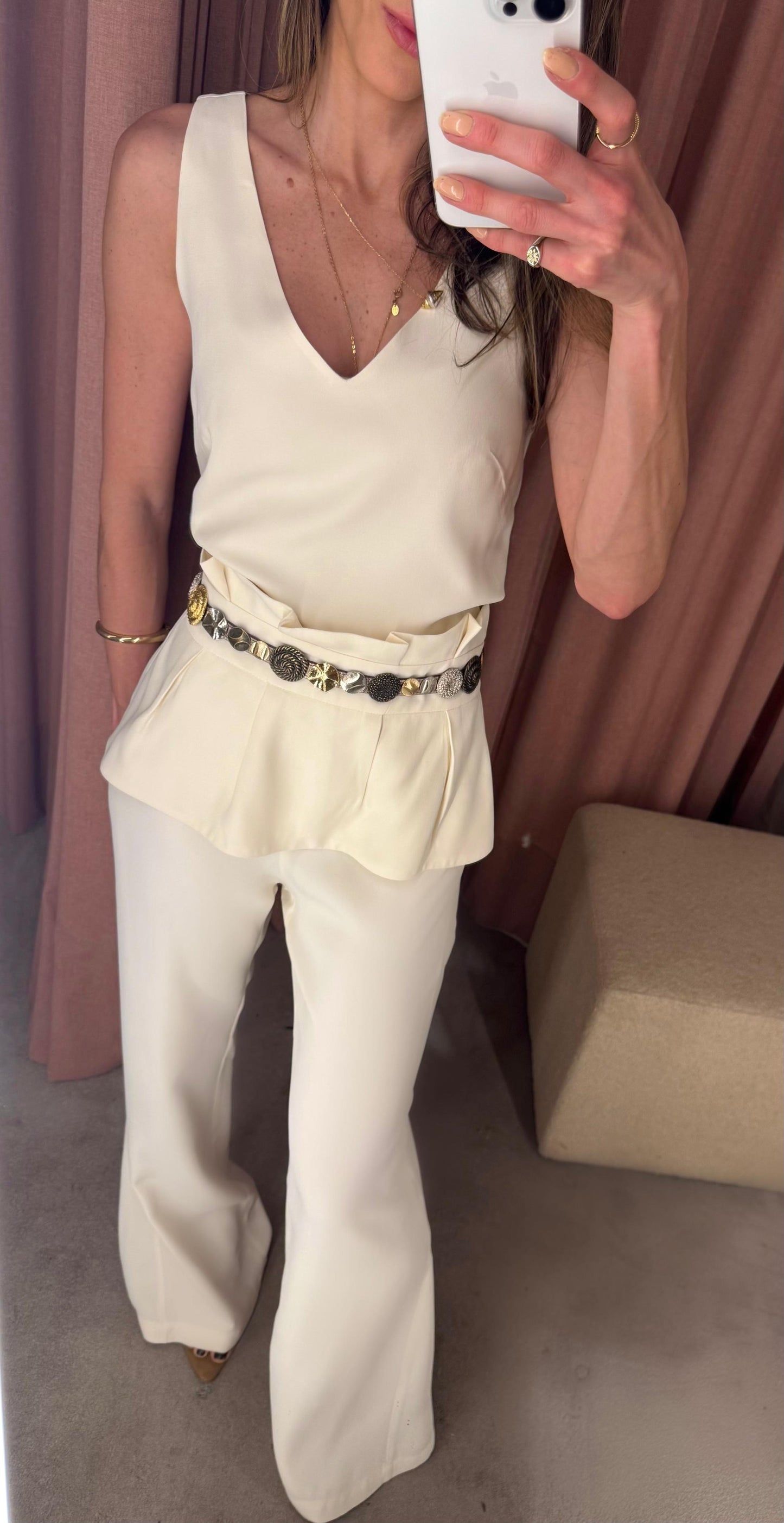 Uma peça que une estrutura e fluidez de forma impecável. Esta calça off-white apresenta uma proposta refinada com sobreposição peplum na cintura, criando uma silhueta feminina e elegante, ideal para looks sofisticados com personalidade. O destaque fica por conta do cinto forrado no mesmo tecido, com fivela retangular encapada, que proporciona um acabamento monocromático clean e ultra chic. A modelagem reta e alongada valoriza o corpo com caimento fluido, ideal para composições minimalistas e contemporâneas. Versátil, vai do office ao evento com facilidade — combine com tops estruturados ou camisas de seda para elevar ainda mais o visual.
