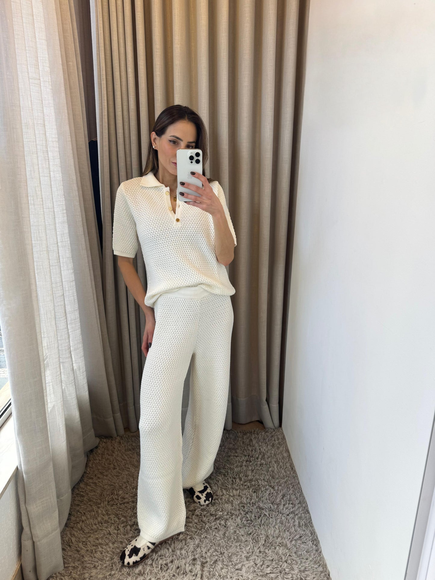 A blusa possui mangas curtas, gola polo com acabamento refinado, decote em V que valoriza o colo e fechamento por três botões frontais, conferindo um charme extra à peça. A calça, de corte reto, traz equilíbrio ao visual com caimento fluido e elegante. Ideal para compor looks casuais chic ou produções mais despojadas com personalidade.