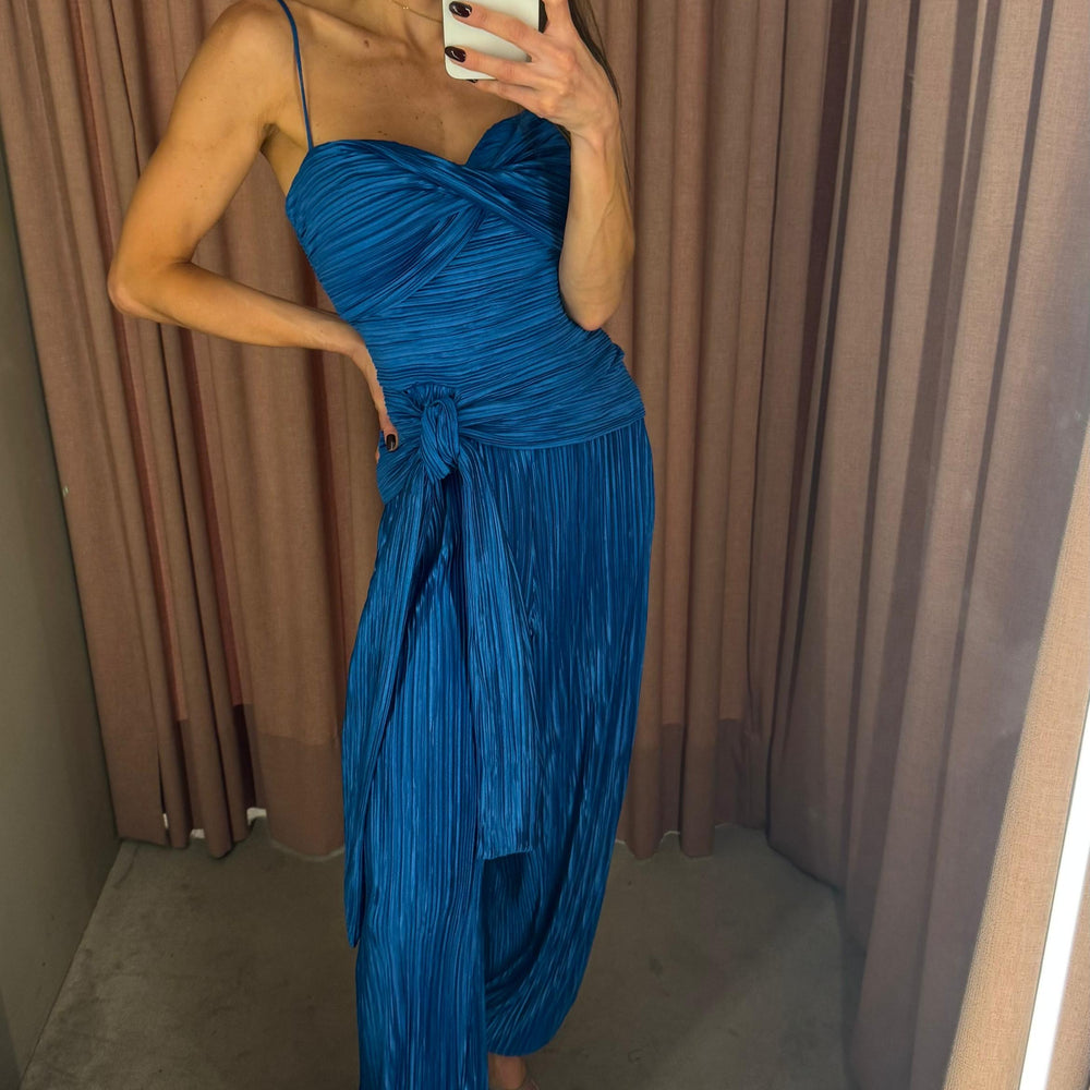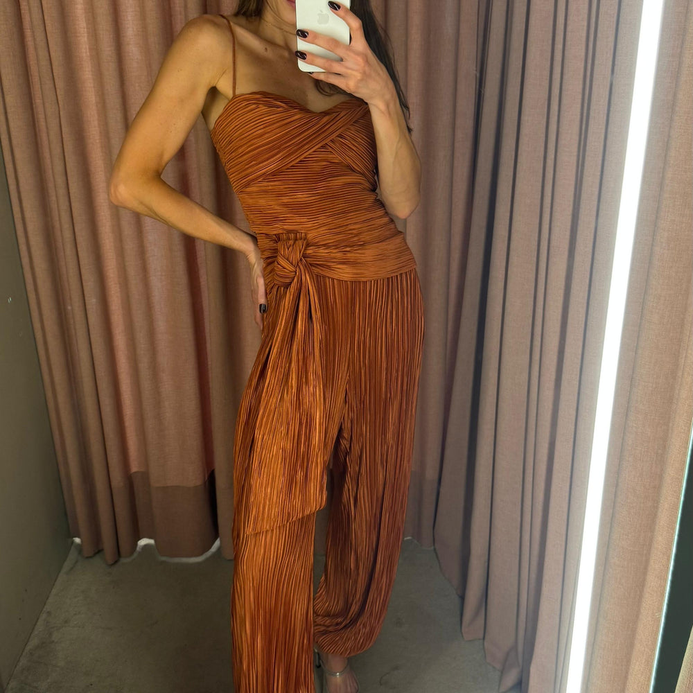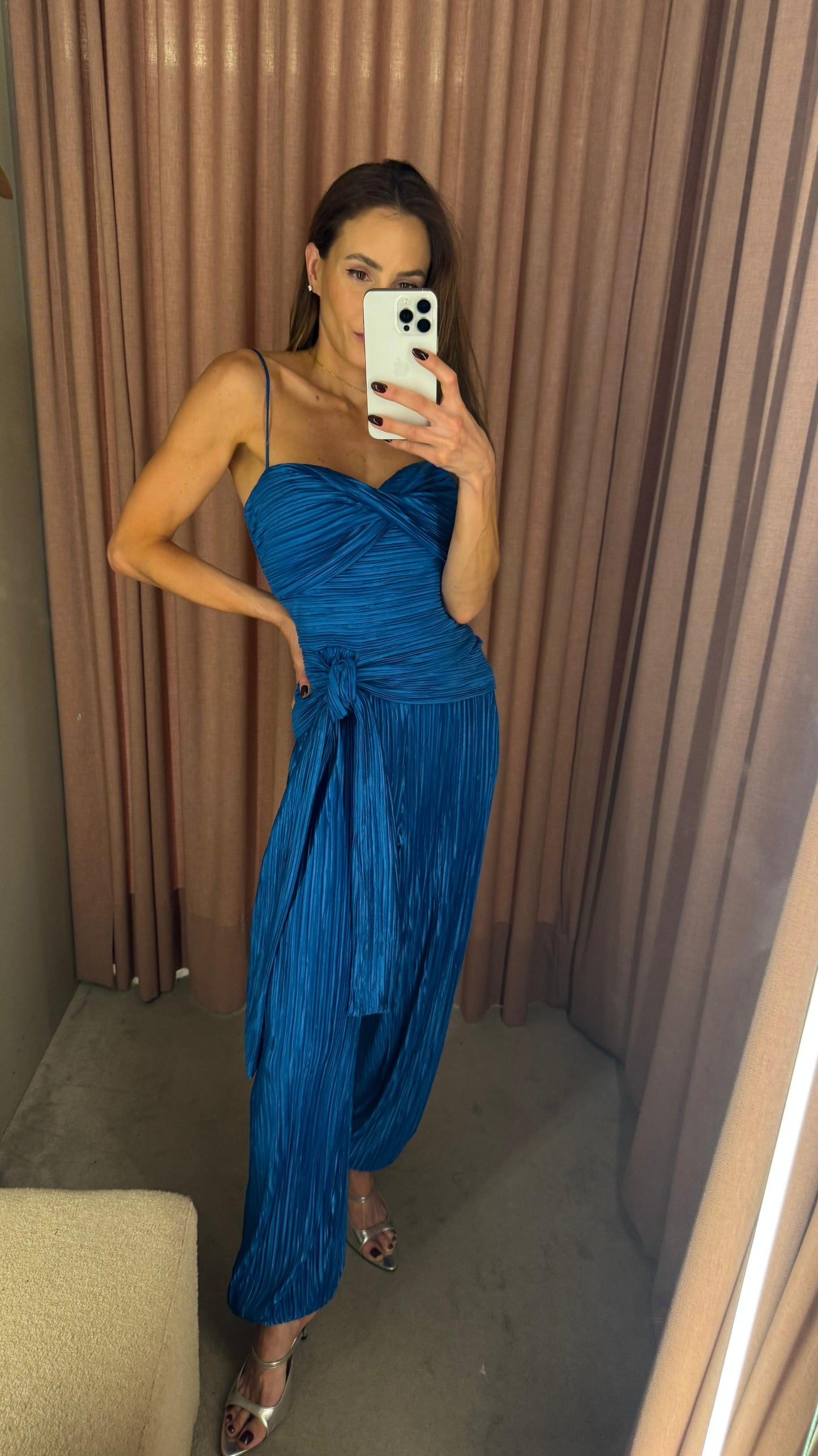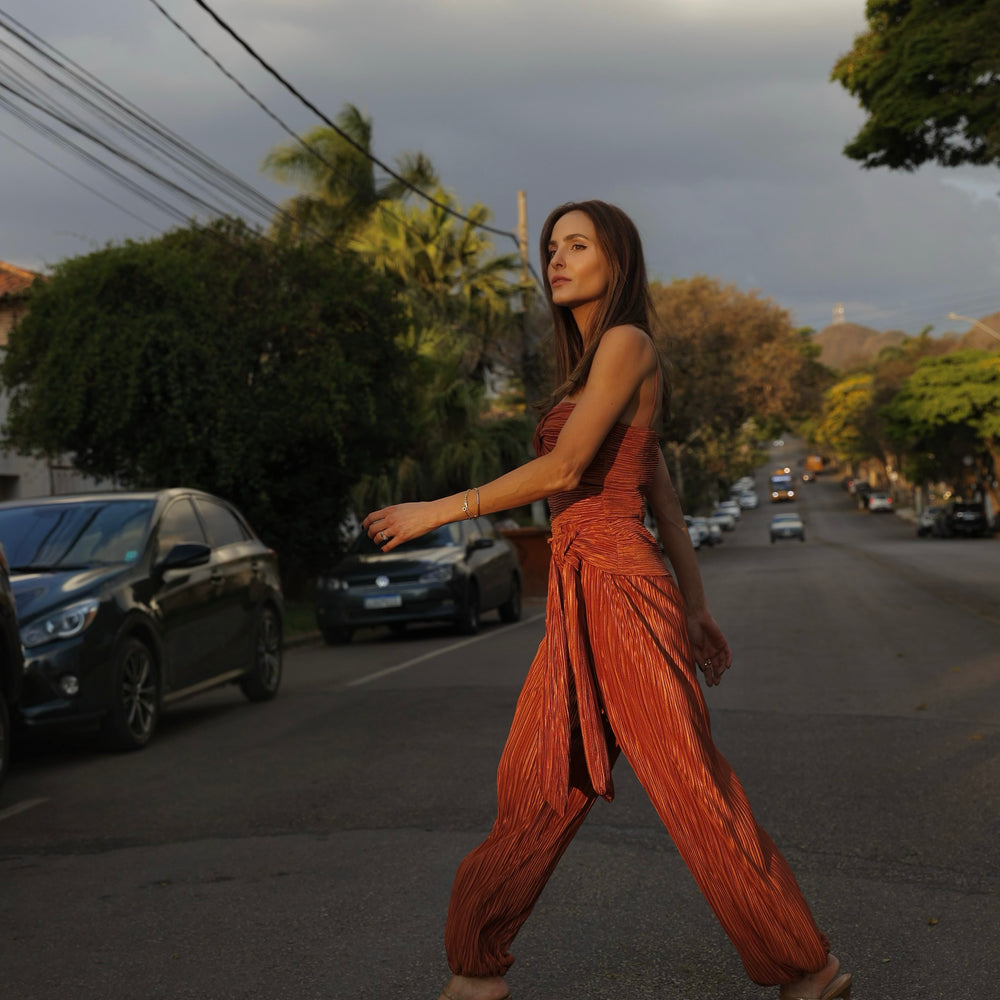 O Macacão Sahara é a união perfeita entre sofisticação e originalidade. Com tecido totalmente plissado, que confere textura rica e um caimento fluido, a peça traz uma proposta ousada e elegante, ideal para ocasiões especiais. A modelagem ampla com inspiração no estilo Aladim contemporâneo valoriza o movimento e traz leveza à silhueta, enquanto o busto ajustado com alças finas garante sustentação e feminilidade. Um dos grandes destaques é a faixa acoplada na cintura, que permite diferentes formas de amarração e styling, marcando a cintura com charme e versatilidade.