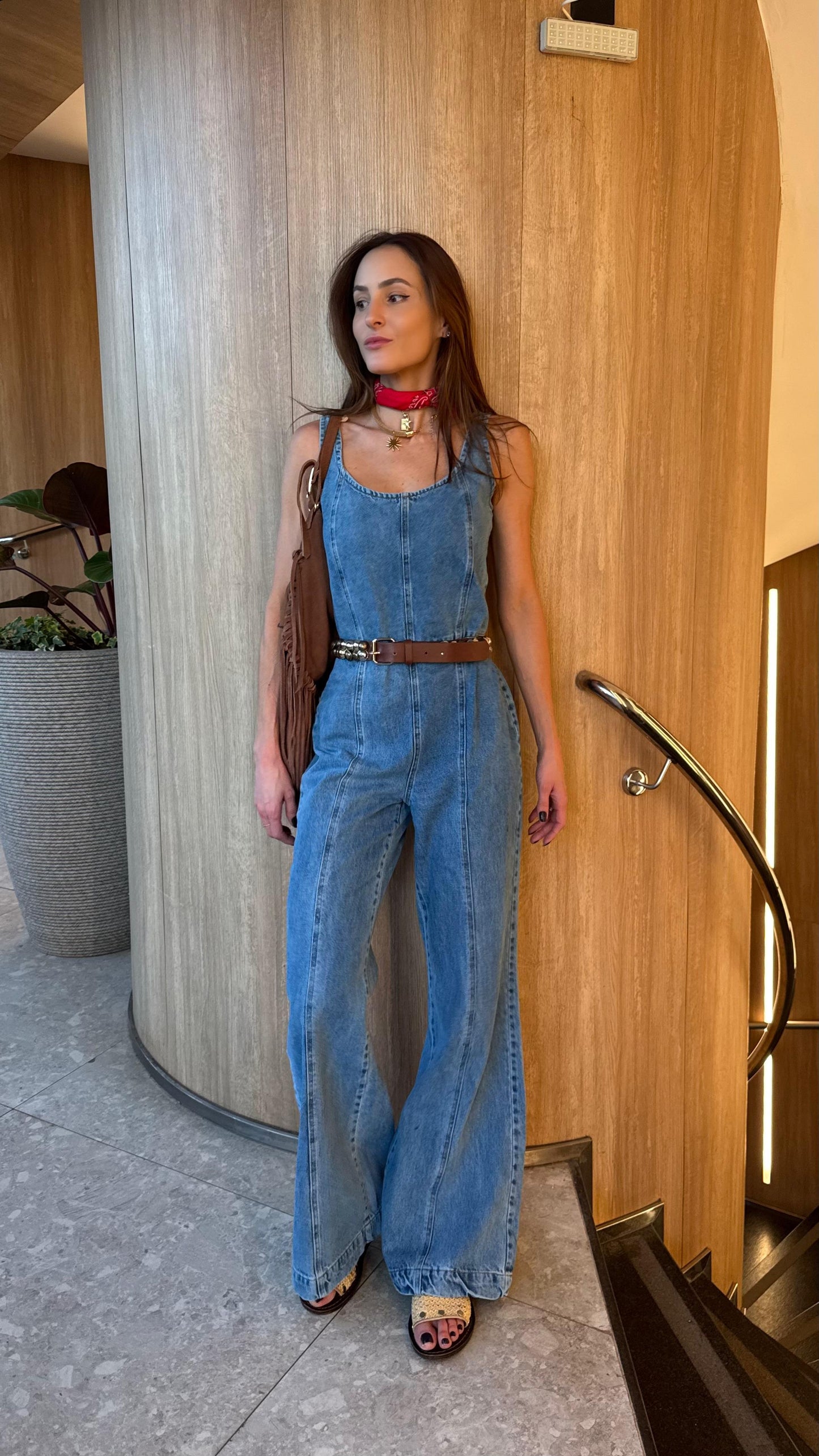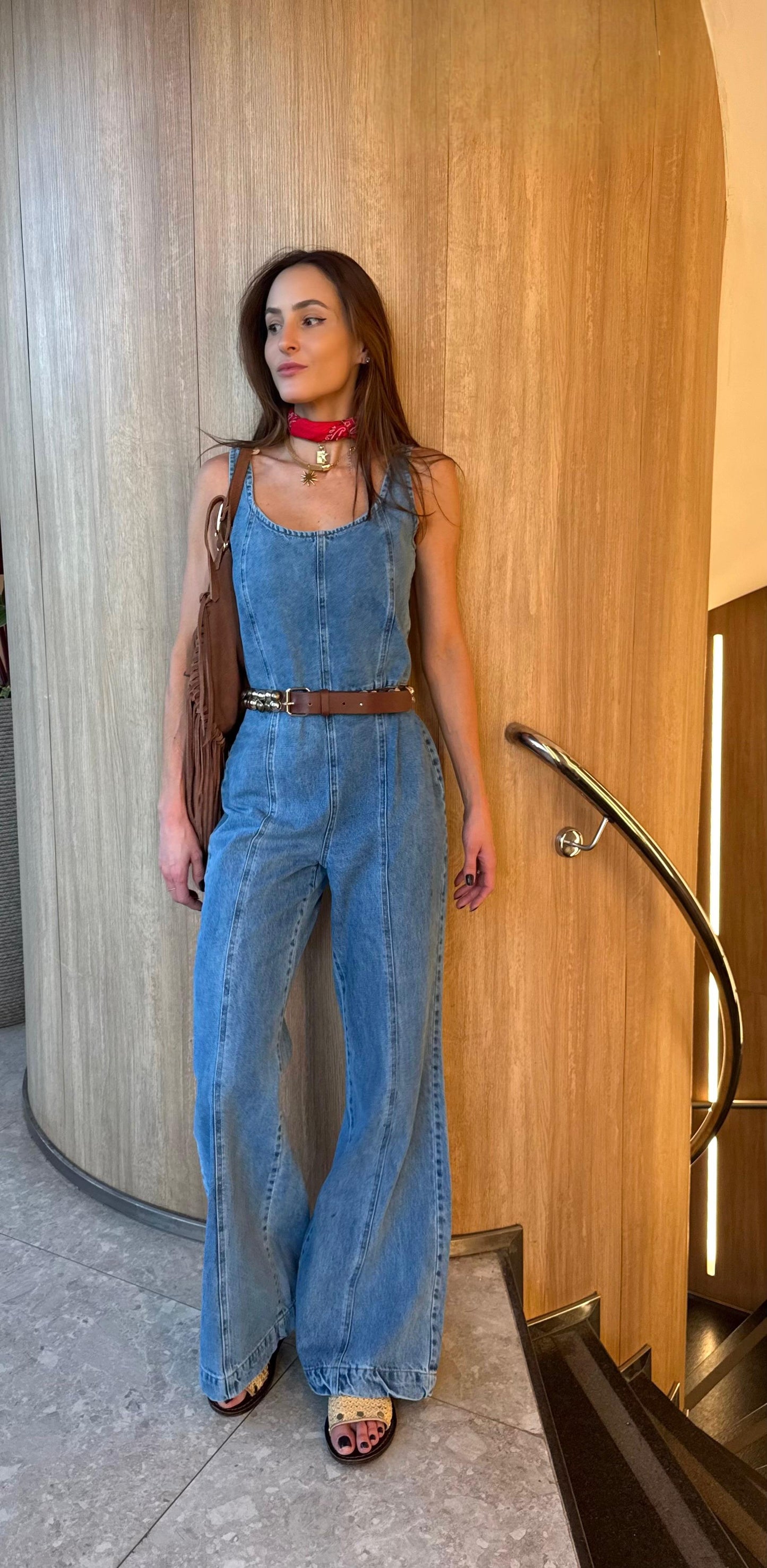 Com alças médias e modelagem fluida, o macacão em denim une conforto e presença em uma única peça. A pantalona alonga a silhueta com naturalidade, enquanto o caimento solto desenha o corpo sem marcar.