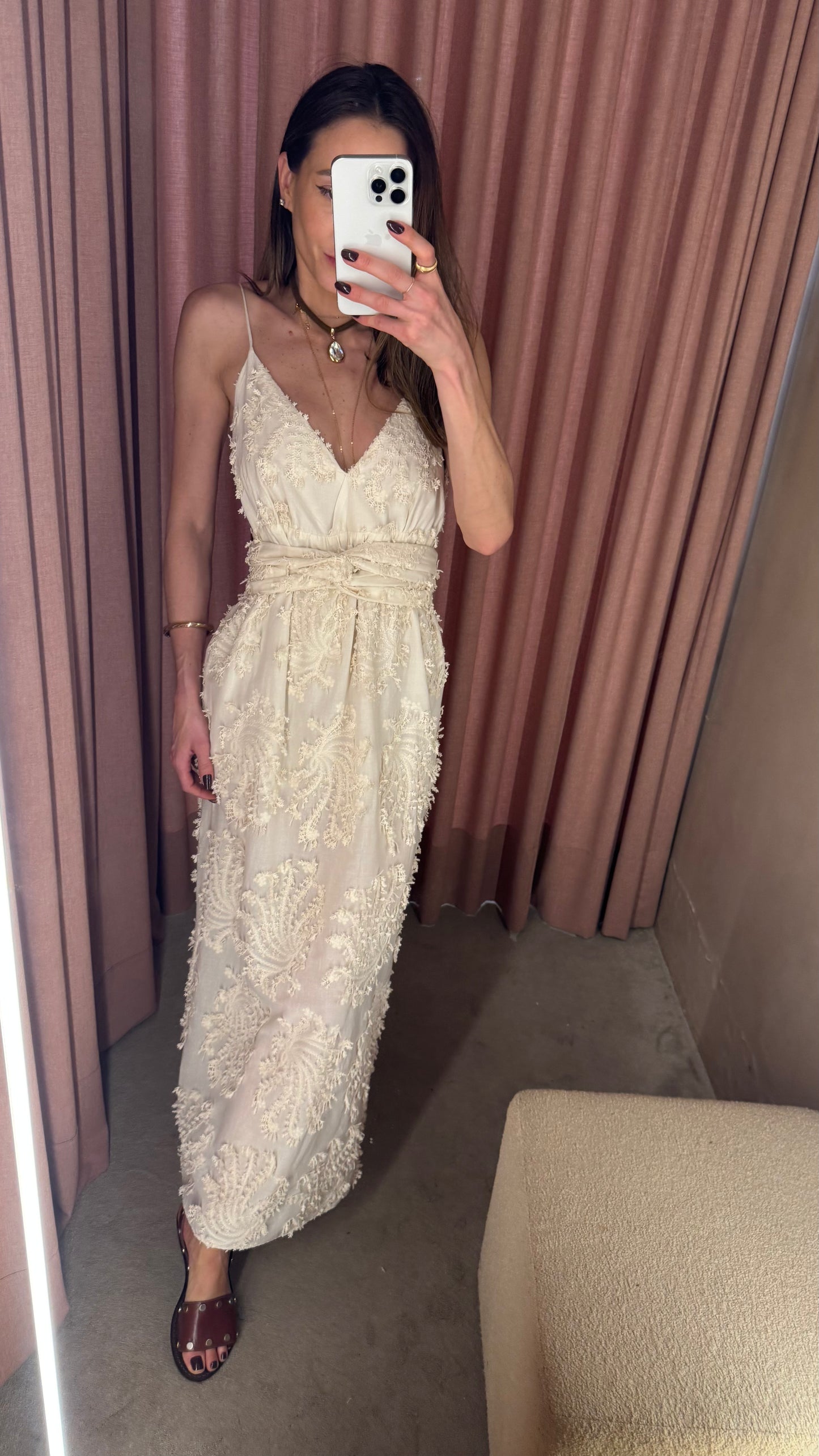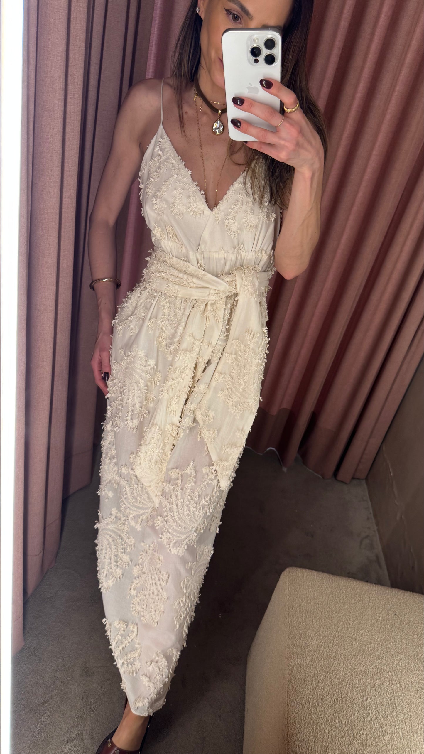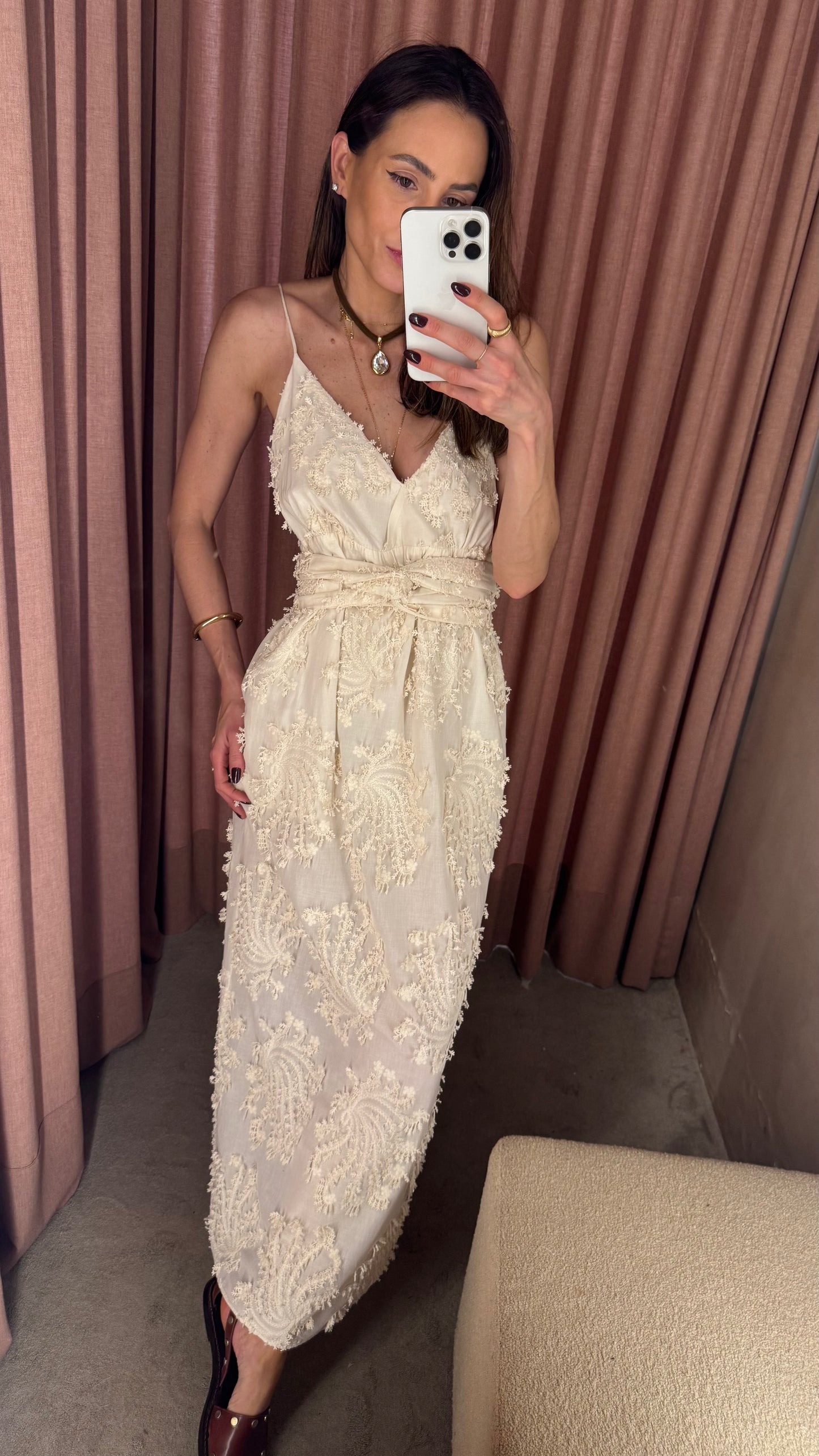 Um verdadeiro sonho em forma de vestido. Com design romântico e sofisticado, o vestido longo em renda traz delicadeza e charme para ocasiões especiais. Possui alças finas reguláveis, decote em V e uma linda amarração com faixa na cintura que valoriza a silhueta. A renda trabalhada em relevo confere um toque artesanal e luxuoso à peça.