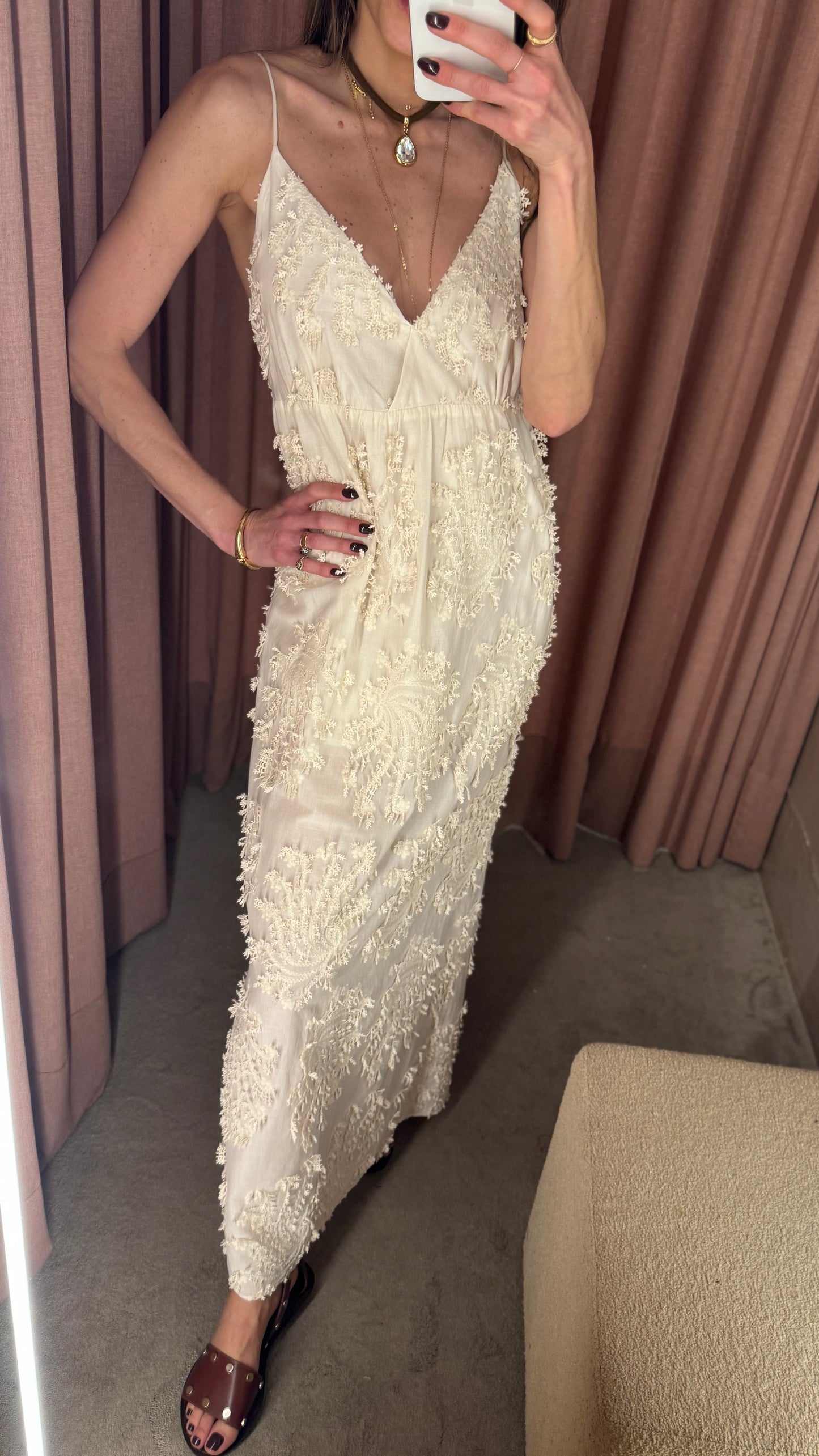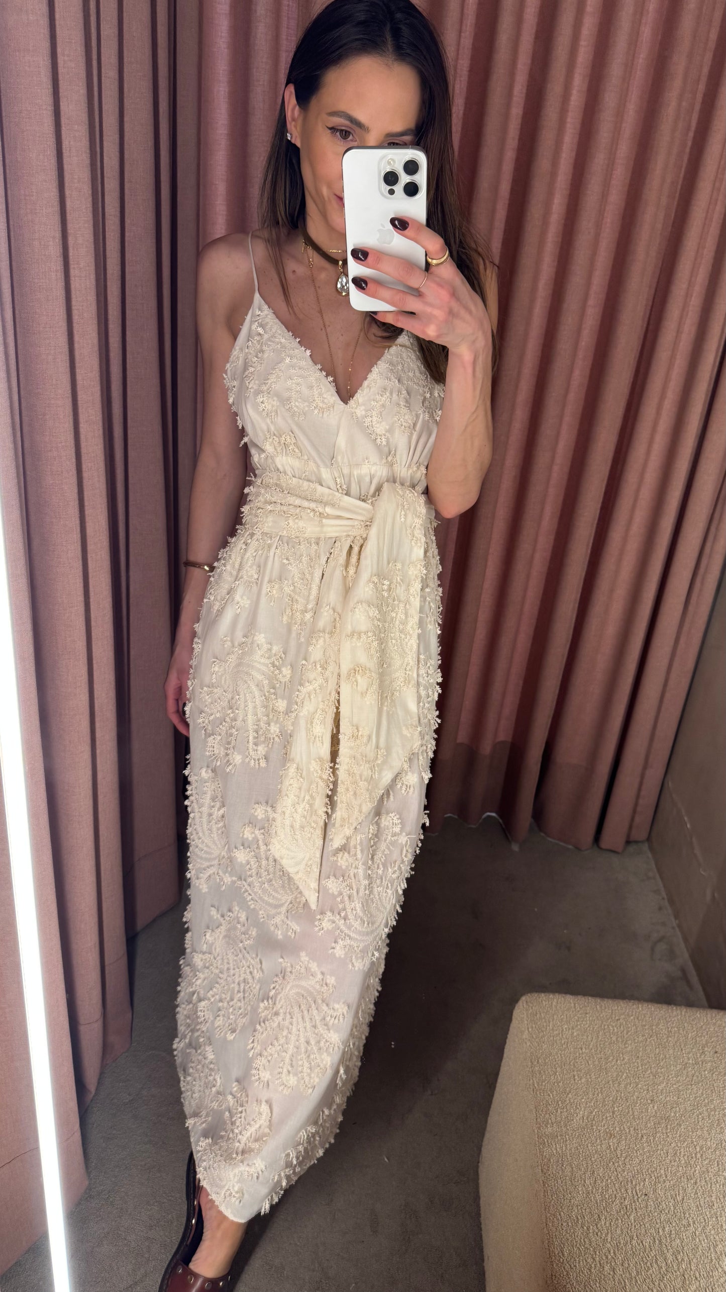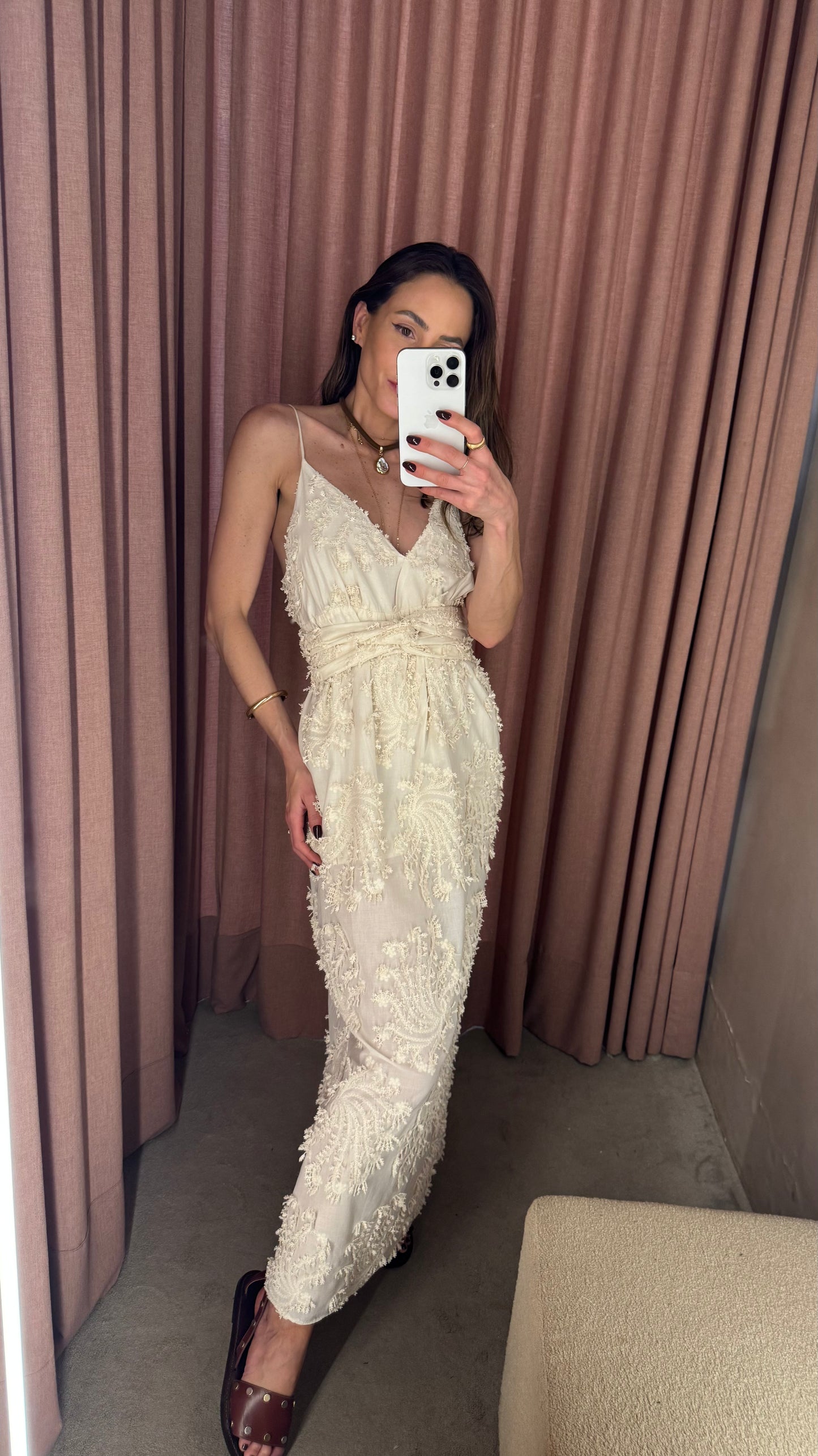 Um verdadeiro sonho em forma de vestido. Com design romântico e sofisticado, o vestido longo em renda traz delicadeza e charme para ocasiões especiais. Possui alças finas reguláveis, decote em V e uma linda amarração com faixa na cintura que valoriza a silhueta. A renda trabalhada em relevo confere um toque artesanal e luxuoso à peça.