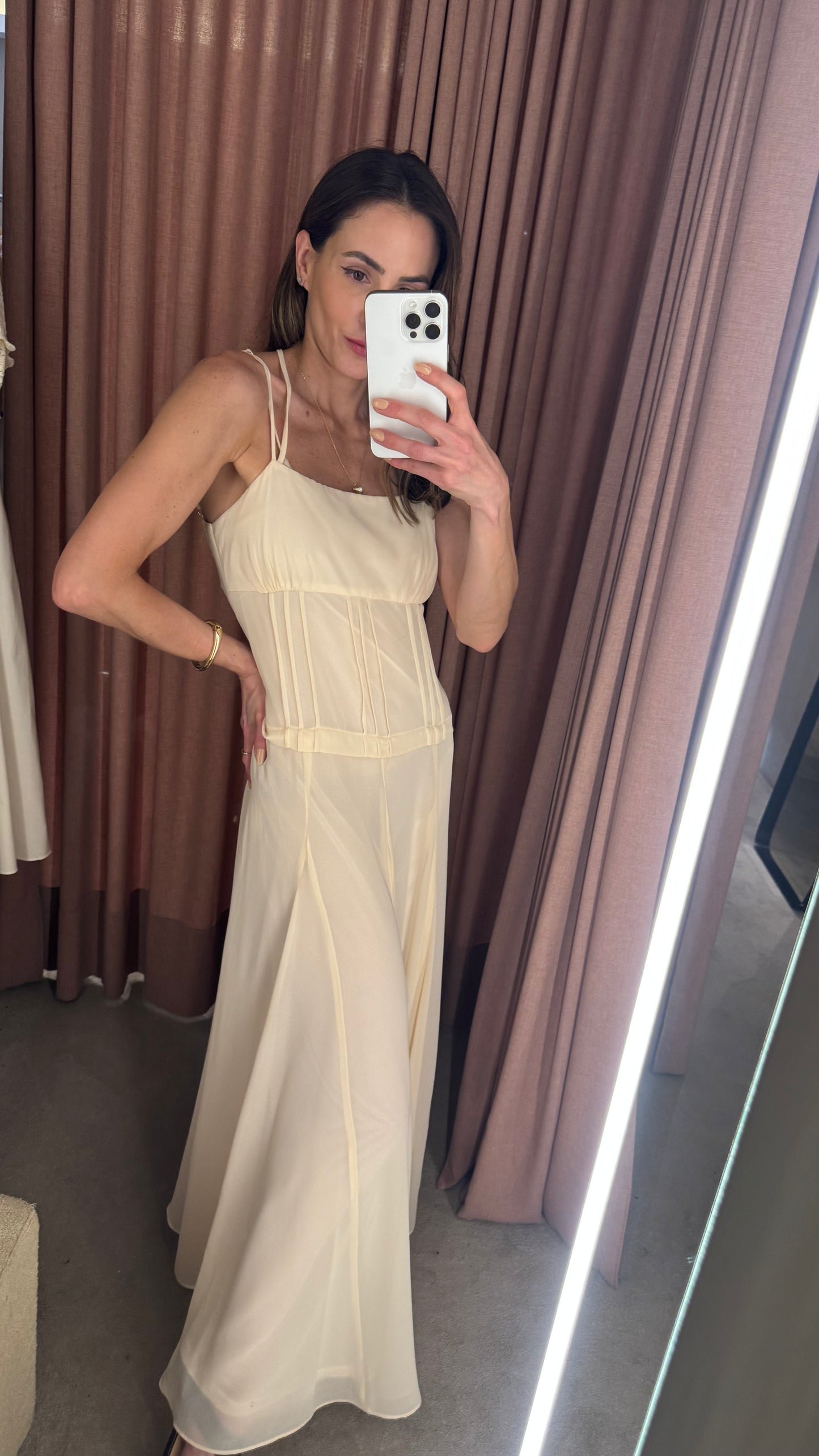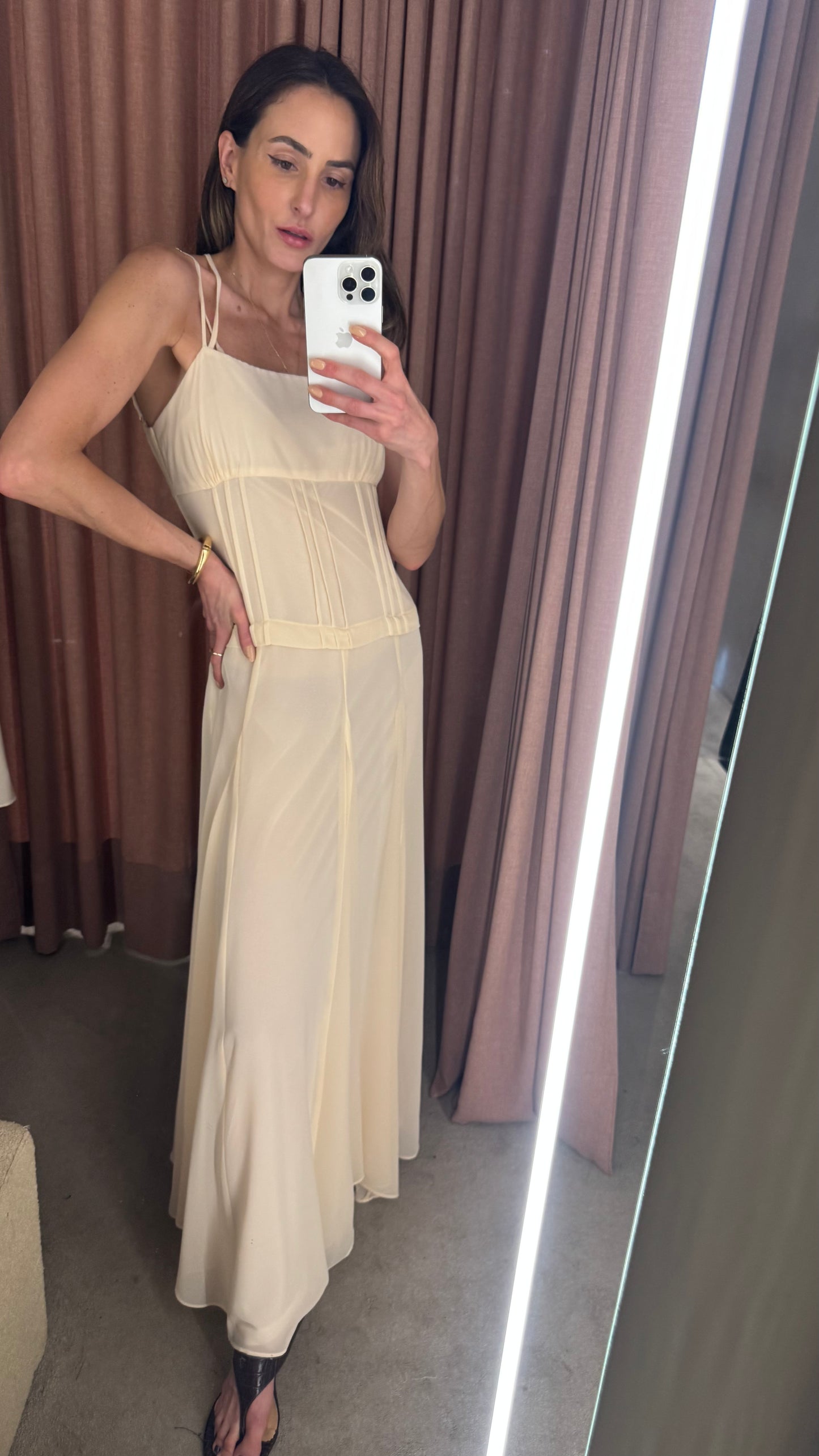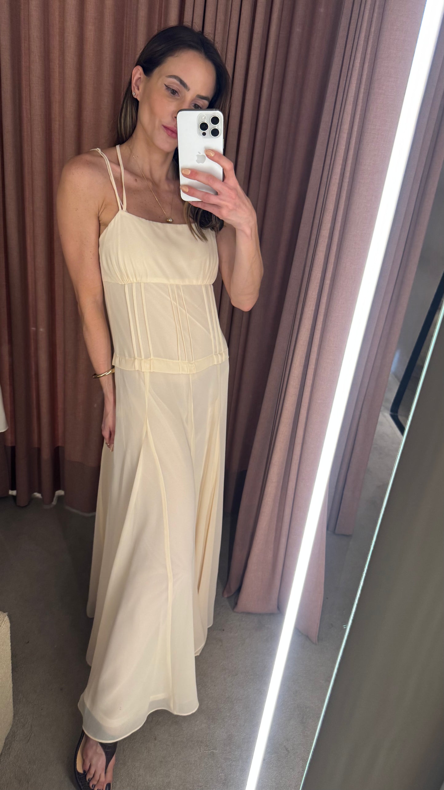 Delicado, fluido e extremamente elegante, esse vestido longo em crepe leve é a escolha ideal para quem busca um visual leve e sofisticado. Com alças finas e recortes sutis, ele valoriza a silhueta de forma natural, oferecendo um caimento impecável. O charme principal está no decote V nas costas, que confere um toque de sensualidade na medida certa, enquanto o zíper invisível nas costas garante praticidade e um acabamento limpo. O tecido leve proporciona movimento e frescor, tornando a peça perfeita para dias quentes ou ocasiões especiais.