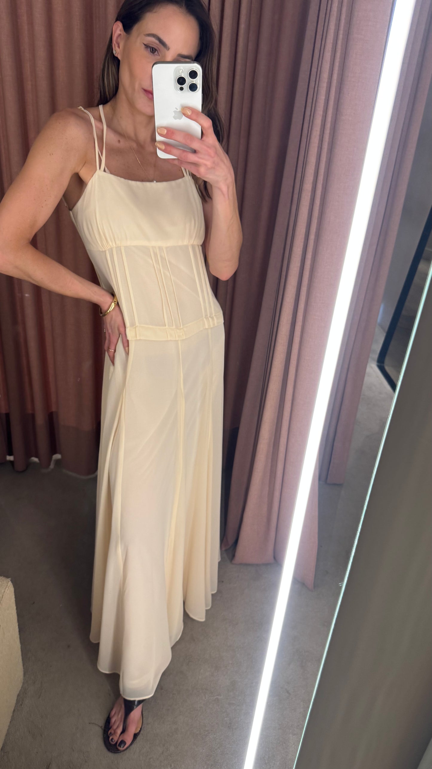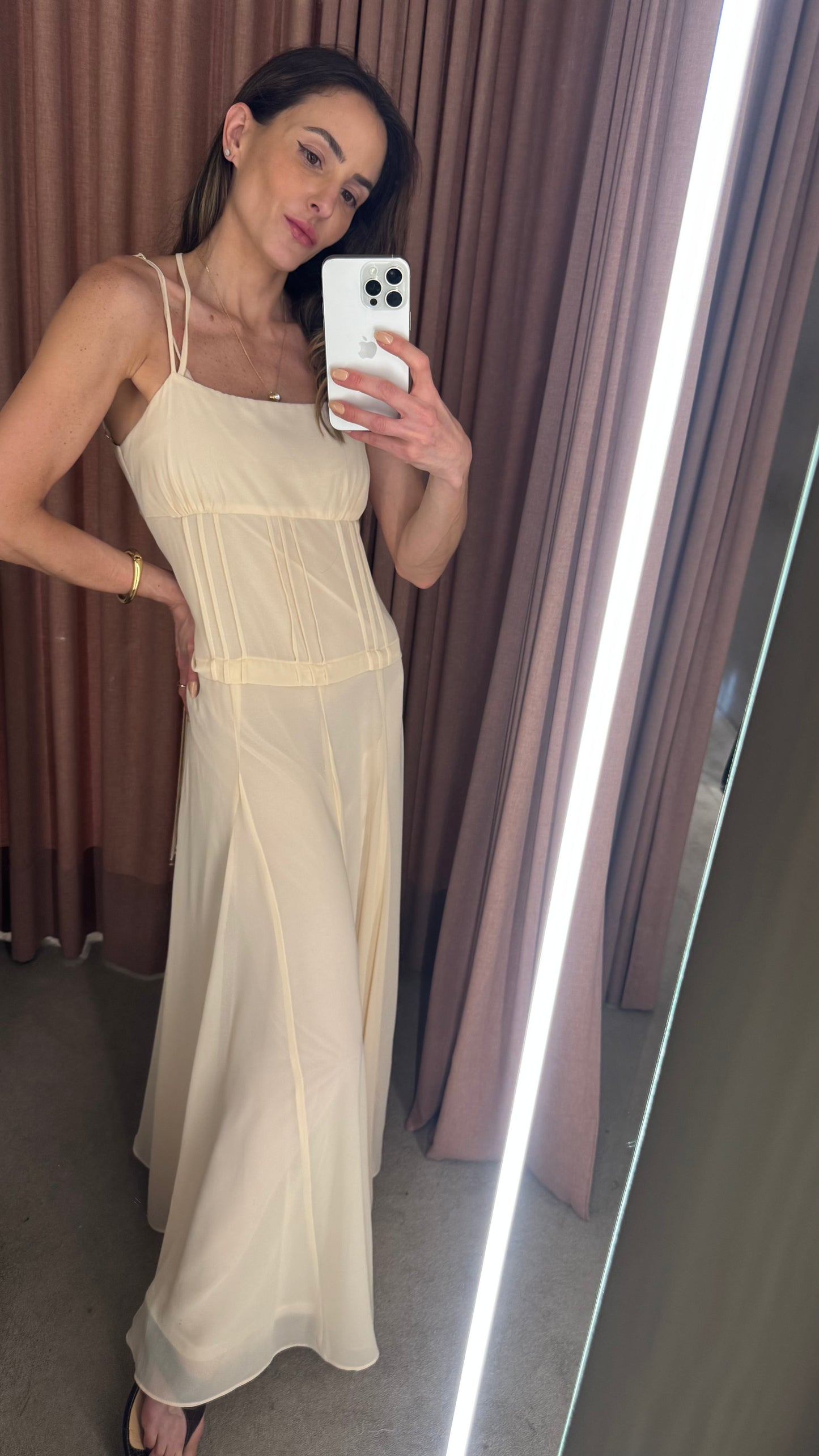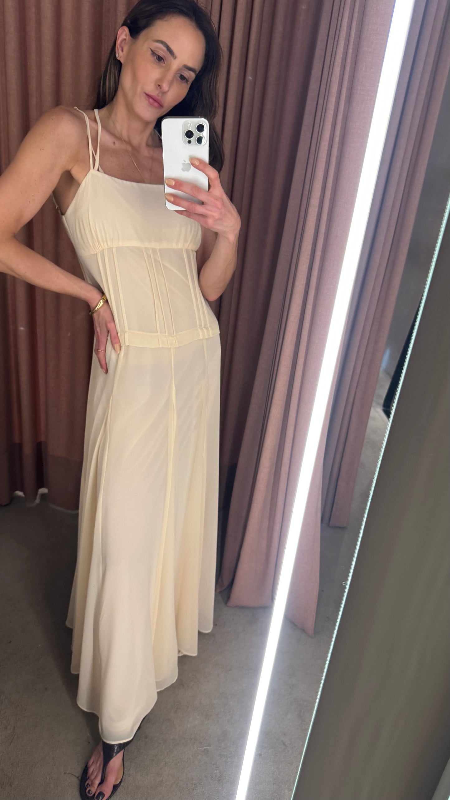 Delicado, fluido e extremamente elegante, esse vestido longo em crepe leve é a escolha ideal para quem busca um visual leve e sofisticado. Com alças finas e recortes sutis, ele valoriza a silhueta de forma natural, oferecendo um caimento impecável. O charme principal está no decote V nas costas, que confere um toque de sensualidade na medida certa, enquanto o zíper invisível nas costas garante praticidade e um acabamento limpo. O tecido leve proporciona movimento e frescor, tornando a peça perfeita para dias quentes ou ocasiões especiais.