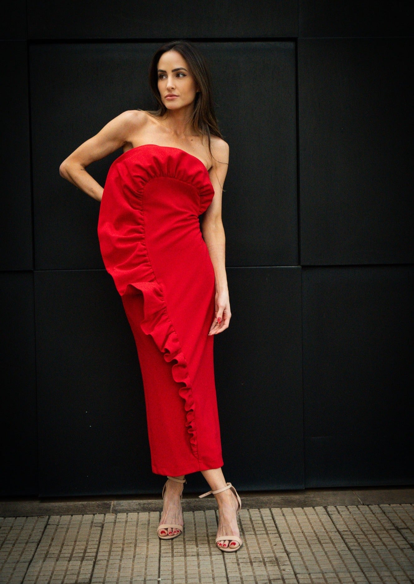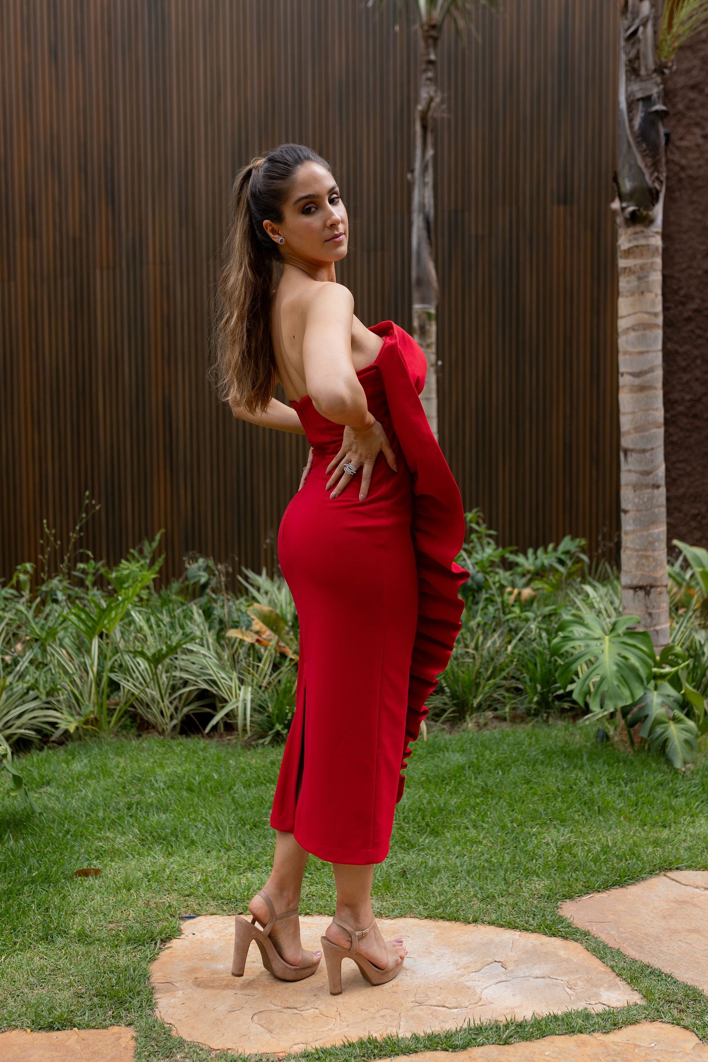 Preço regular R$ 599,00Vestido midi, tecido encorpado, com babado no início do colo até final do vestido, fazendo efeito drapeado