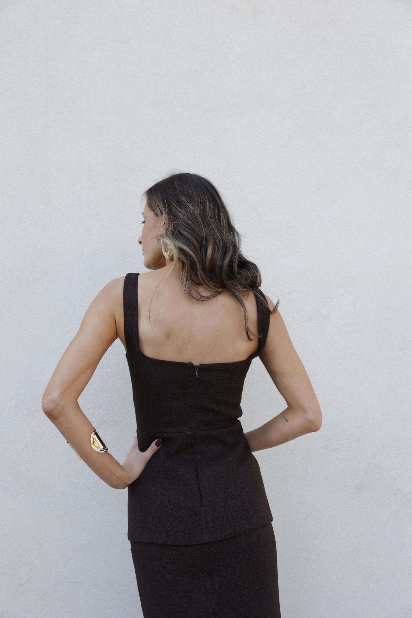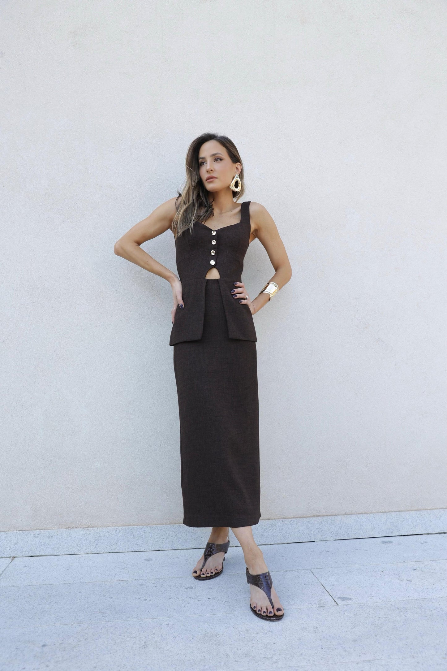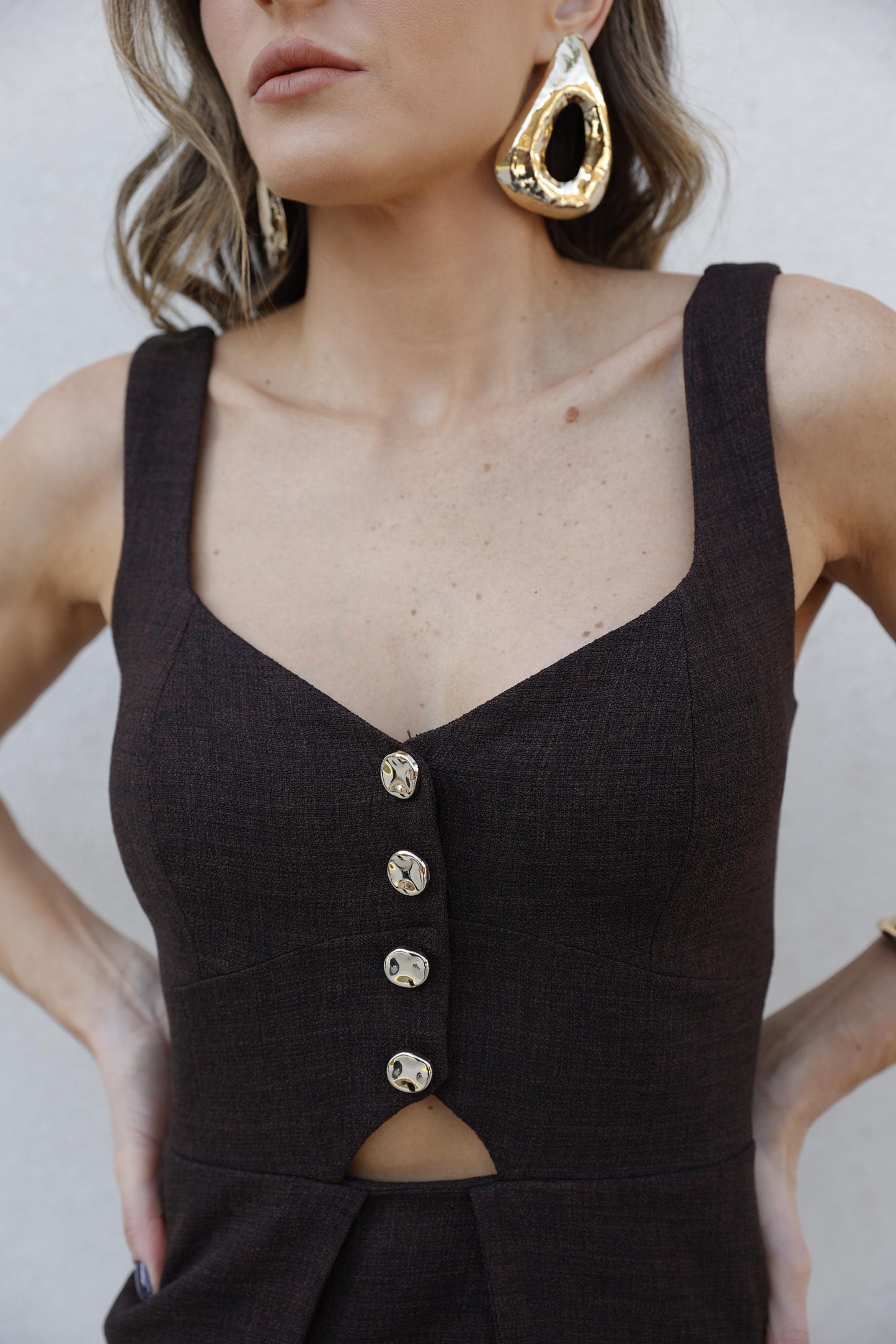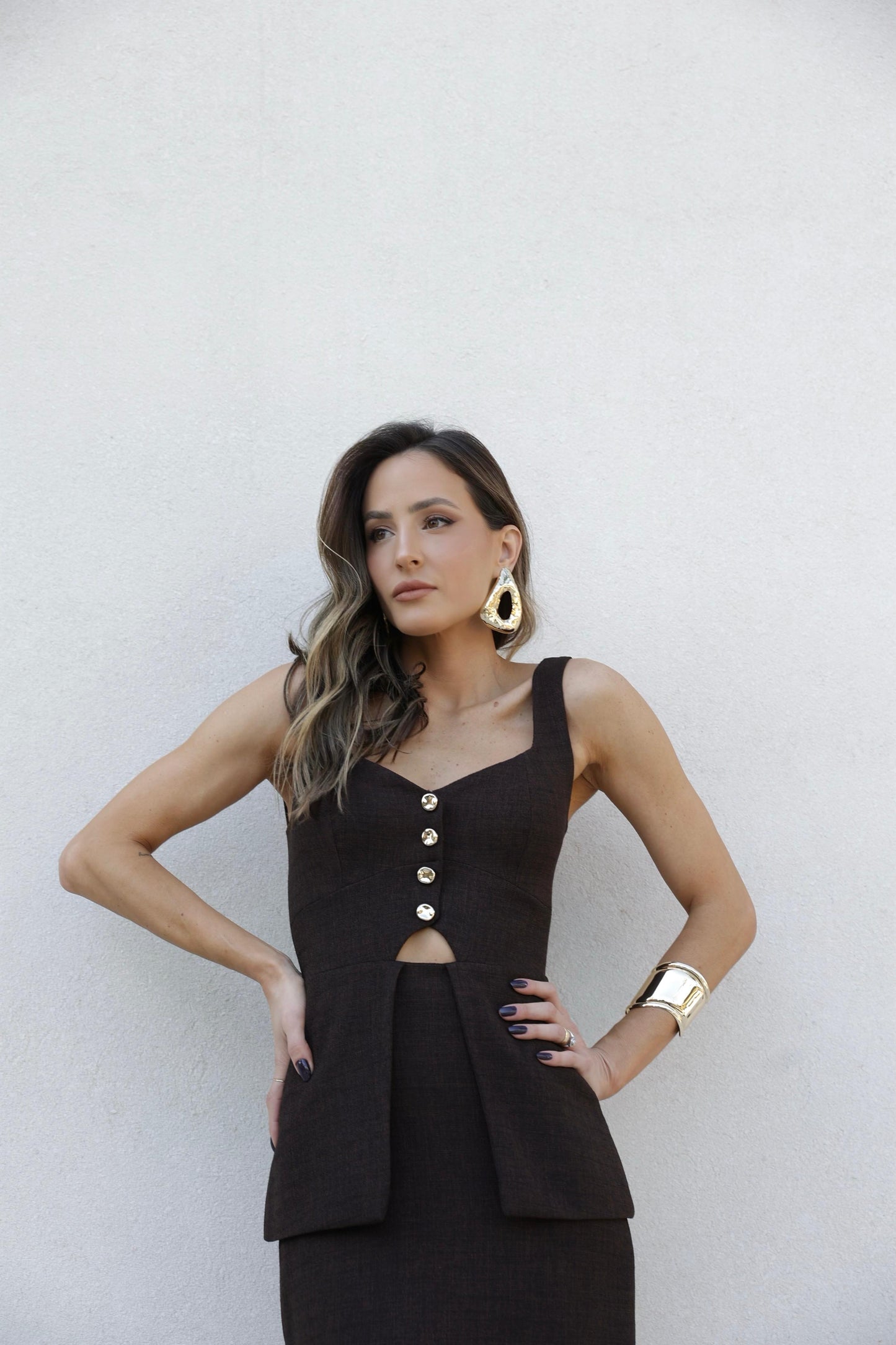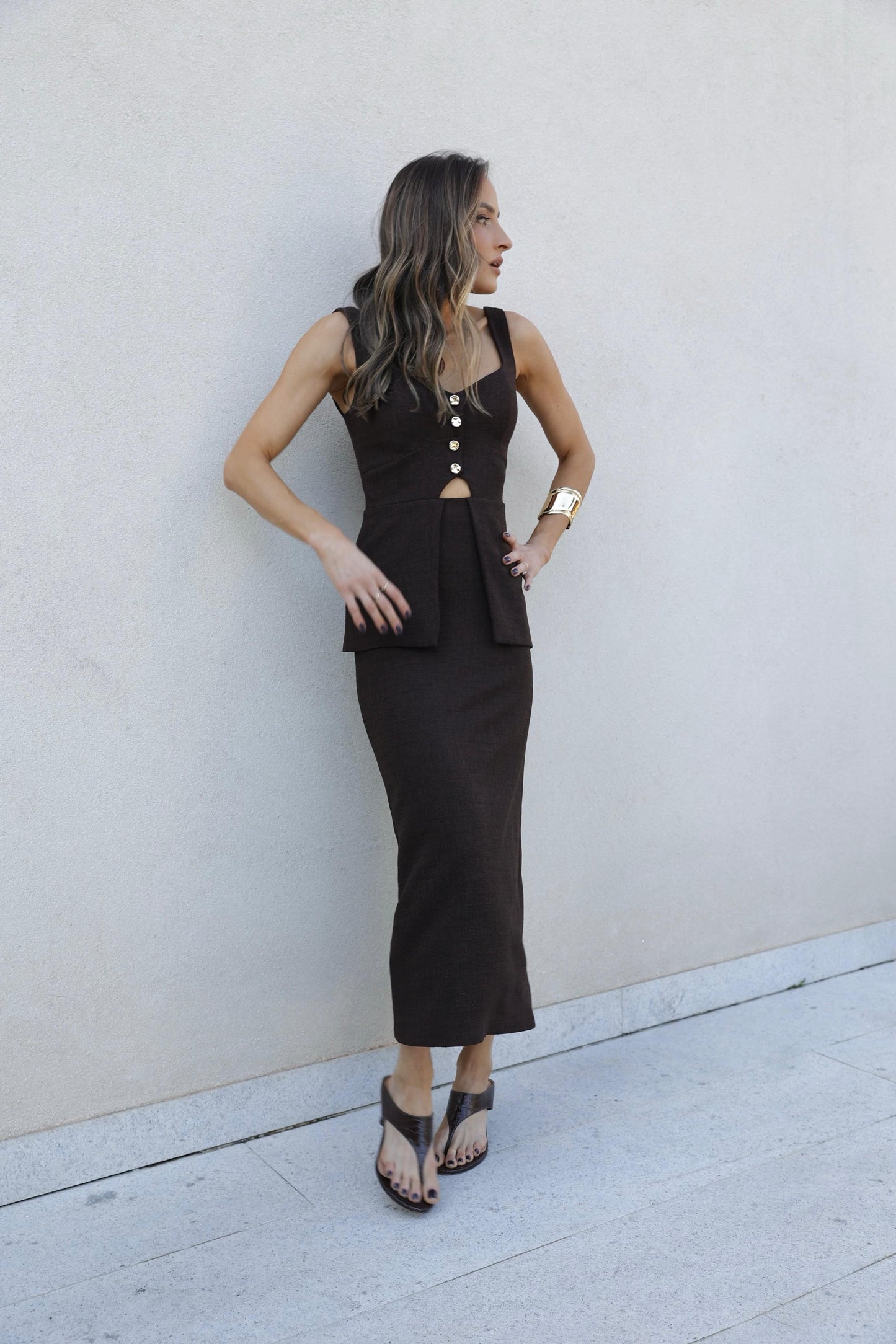 Um clássico moderno com detalhes sofisticados. Este vestido midi de alças médias destaca-se pelo peplum na cintura, que valoriza a silhueta com delicadeza, enquanto a fenda atrás traz um toque de sensualidade discreta. O decote ganha charme extra com botões delicados, criando uma composição feminina e refinada, perfeita para ocasiões que pedem elegância com personalidade.